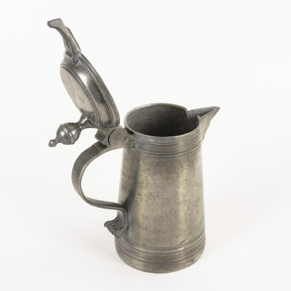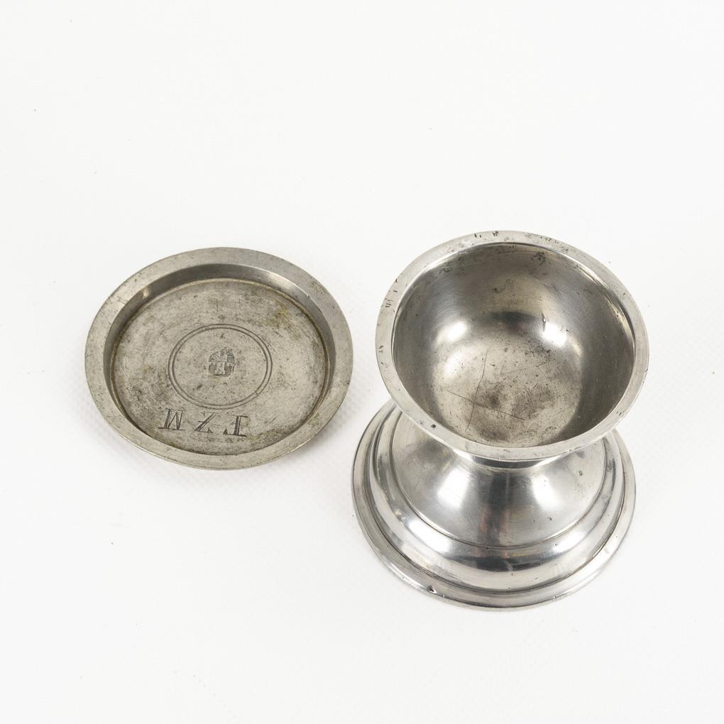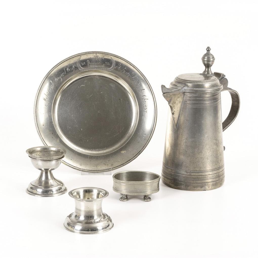 Gemarkte Schnabelstitze mit Gravur "MR J". "Graef" gemarkter Zunftteller mit Zunftzeichen der Tischler, Datum "1833" und Namen der Meister. 3 Gewürzgefäße/Salieren (1x mit Gravur "EEP 1819"). Gemarkter Untersetzter mit Gravur "FZM". 2 kleine Lötreparaturen, Alters-/Gebrauchsspuren.