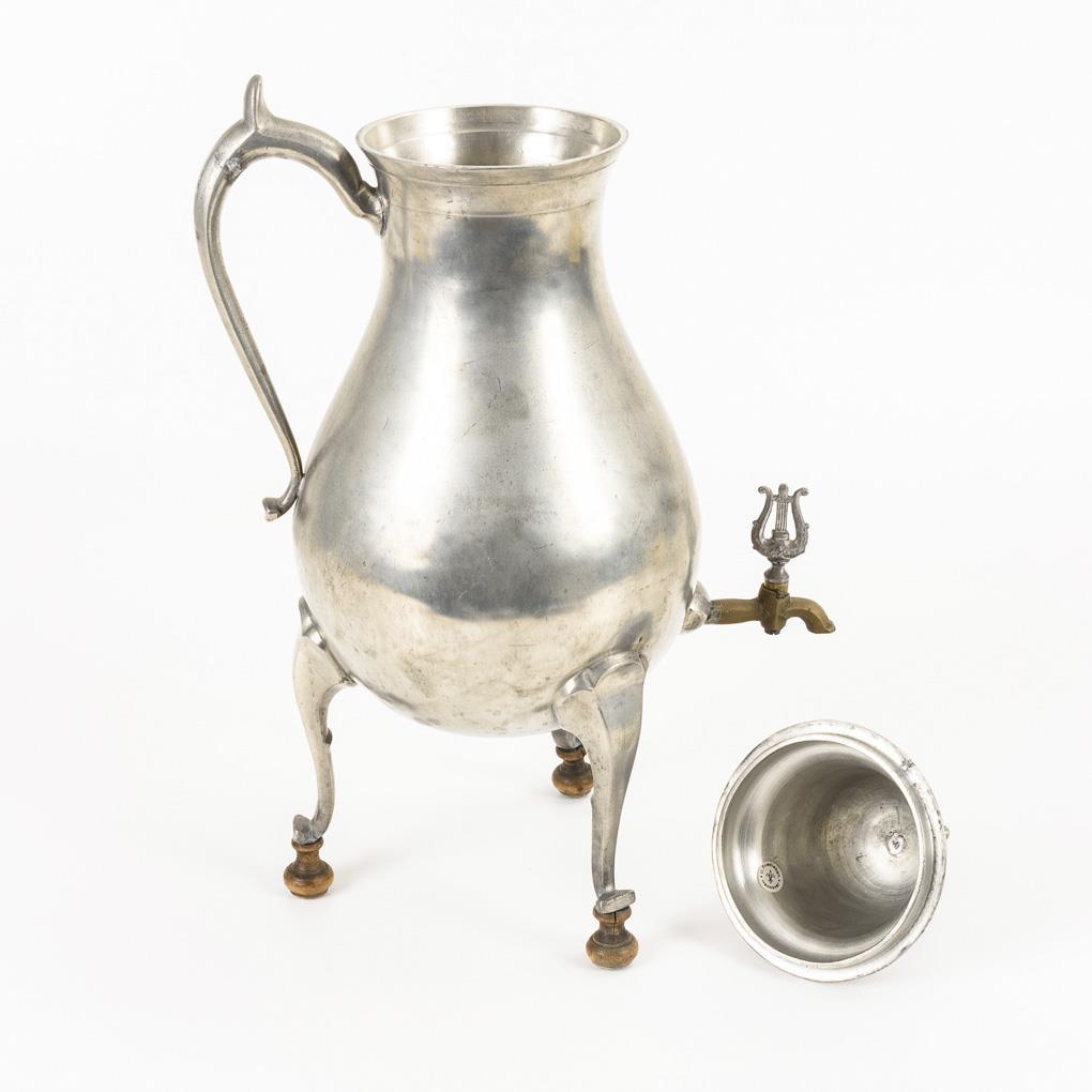 Kranenkanne in Balusterform auf Holzfüßen sowie mit Holzknauf auf dem Passdeckel. Messing-Ausguss mit Lyra-Küken. Einige wenige Alters-/Gebrauchsspuren.