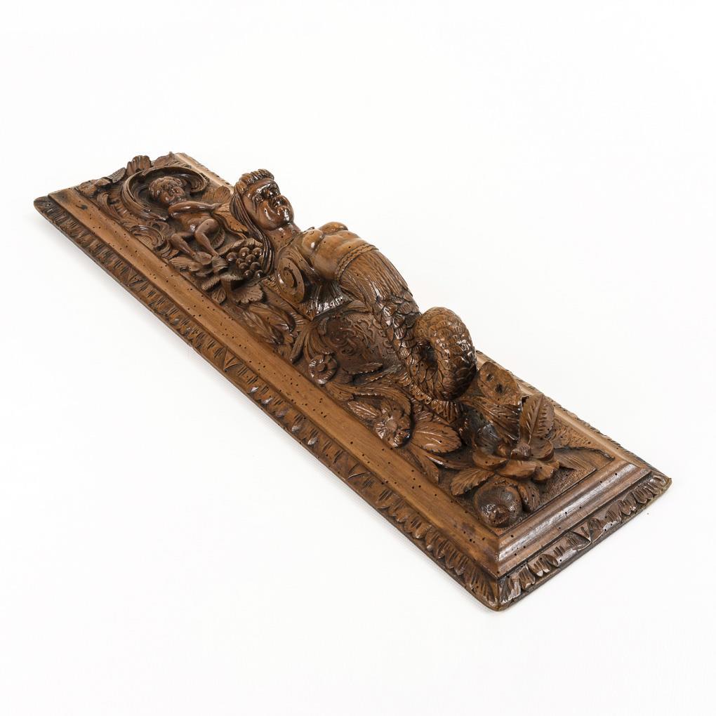 Meerweibchen als Griff über der Monogramm-Kartusche auf dem Grundbrett mit Putto, Rocaillen und vegetabiler Zier. Schwanzspitze fehlt, geringe Trockenrisse, Anobienspuren.