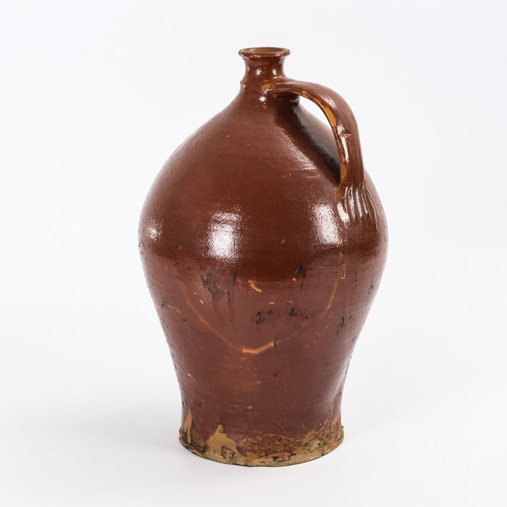Bauchige Form mit Enghals und Bandhenkel, schauseitig bezeichnet und datiert. Alters- und Gebrauchsspuren, am Boden beklebt (wohl restauriert).
