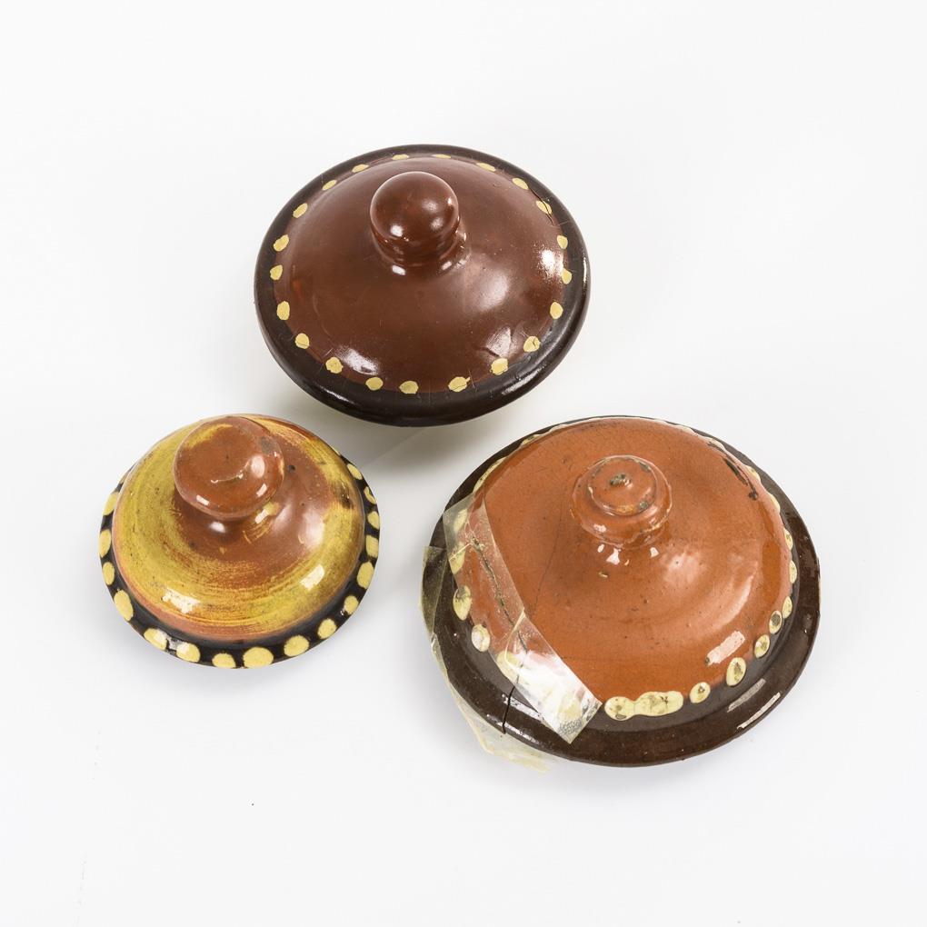 Heller Scherben mit rot- und dunkelbrauner, teils honiggelber Glasur, farbigen, floralen Reliefauflagen und weißem Pünktchendekor. H 17 bis 26 cm.