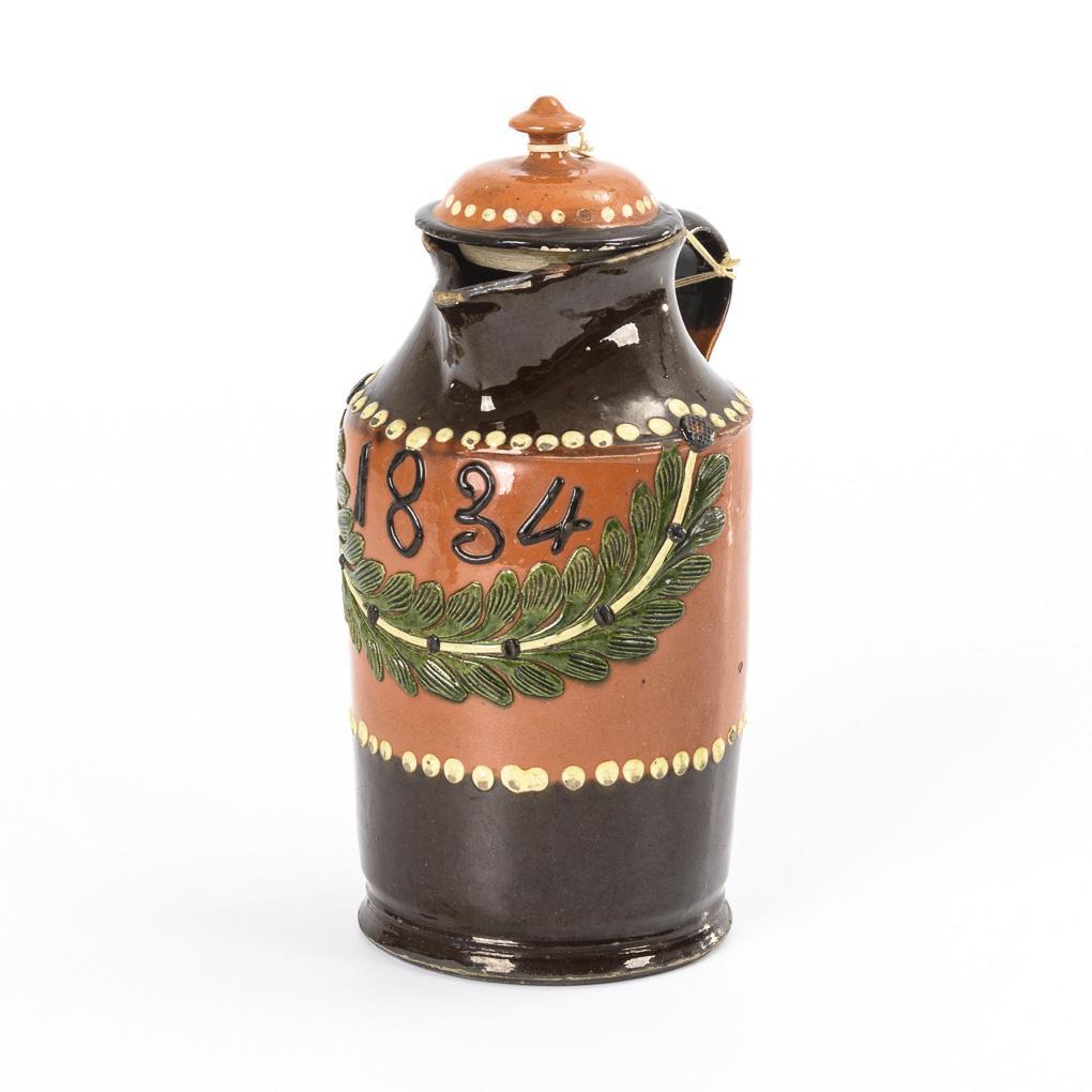 Zylindergefäß mit spitzer Schneppe, Ohrenhenkel und gewölbtem Deckel mit Knauf. Schauseitig ein Zweig, datiert "1834". Deckelrand und Knauf restauriert, Glasurdefekte.