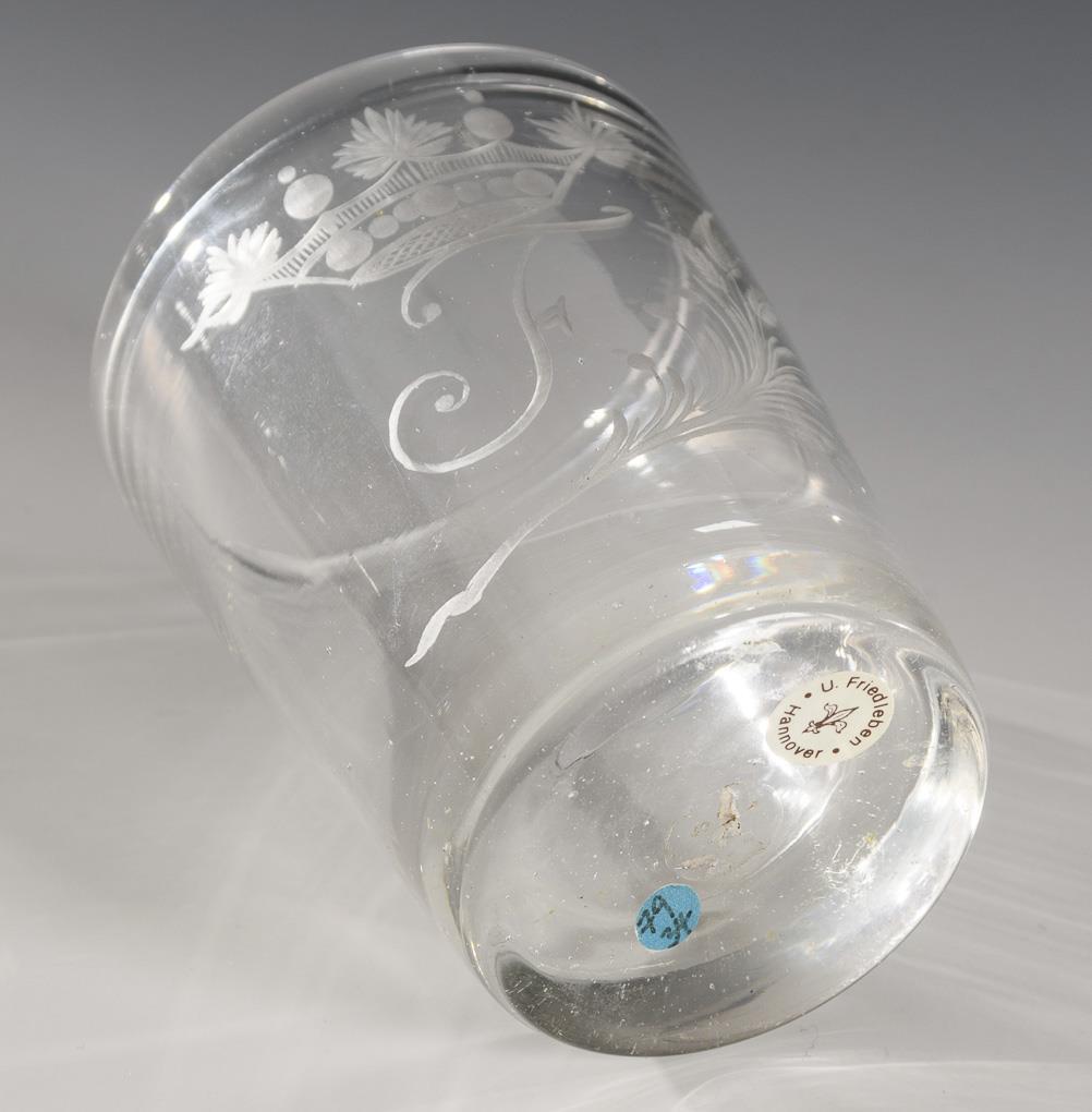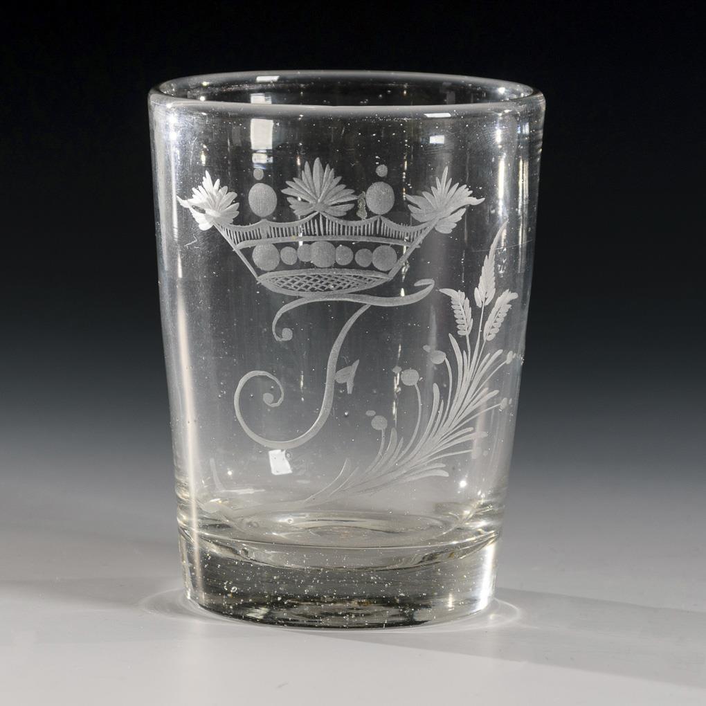 Leicht konischer Becher. Schauseitig die bekrönte Initiale "F".