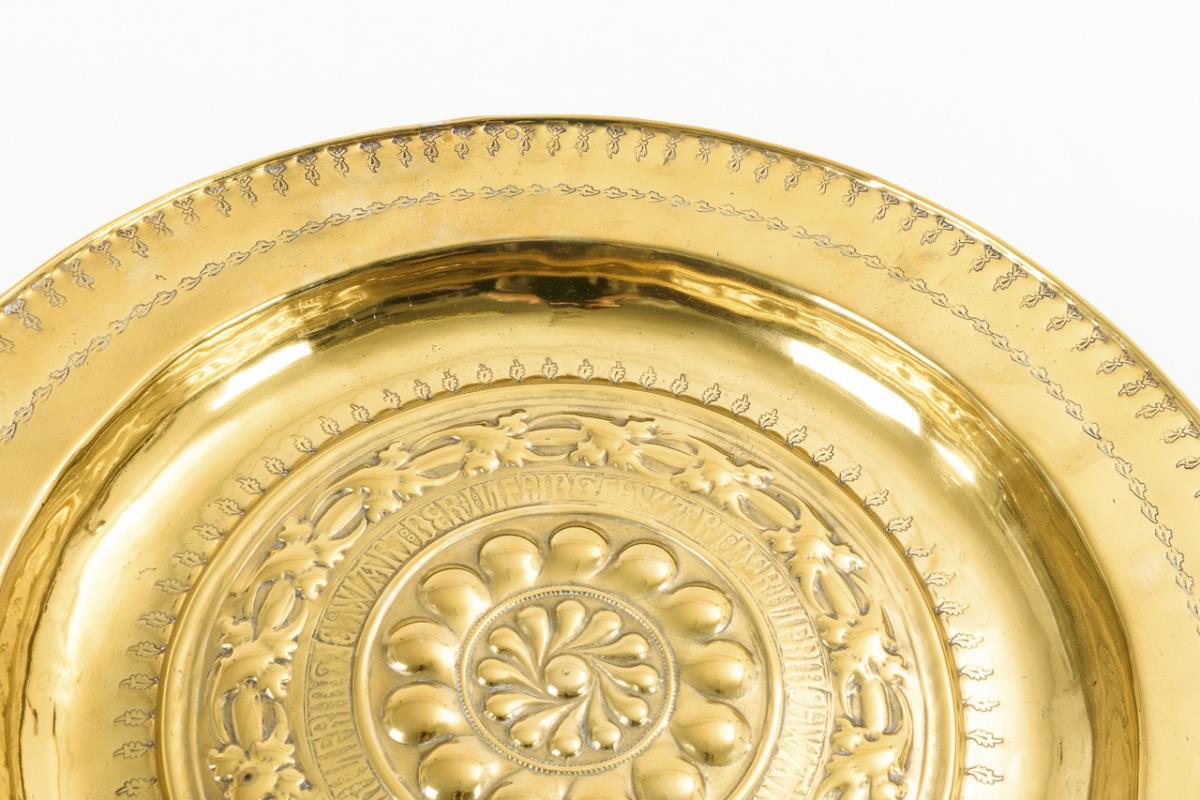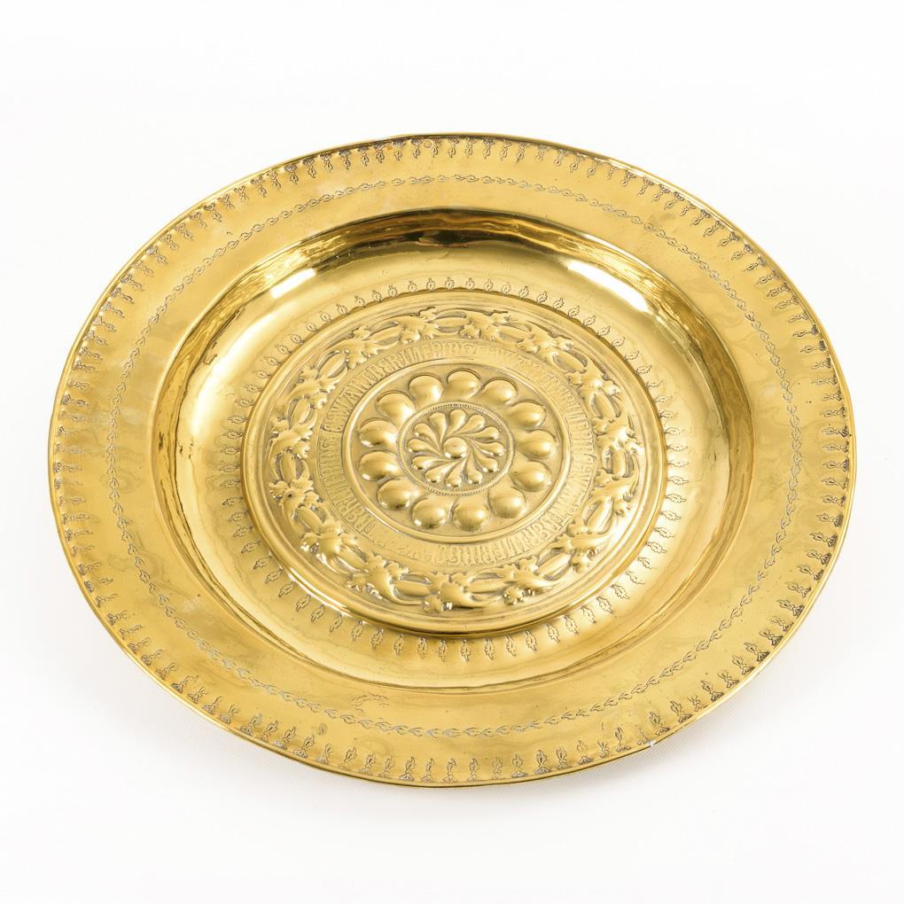 Messing in Form geschlagen und punziert, gebördelter Rand mit Eisendraht. Ø 57 cm.