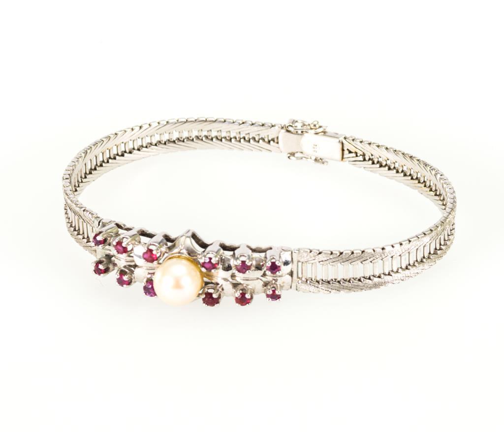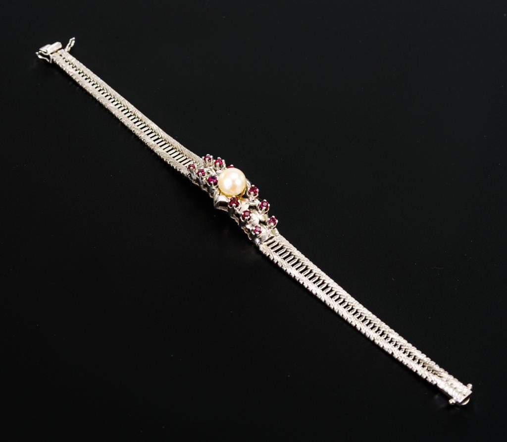 Cremefarbene Zuchtperle und 12 Rubine, zwischen Zierpanzerkette. Kastenschloss mit 2 Achtersicherungen.