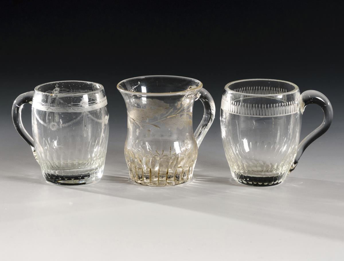 5 Henkelbecher (H 4x ca. 7,5 cm und 1x 10 cm): 4x graviert und überwiegend mit Kerbschliffkranz. / 1 Kelchglas mit gravierten Sternchen (H 10 cm). / 1 Schnapsbecher (H 4 cm) mit einer gravierten Hausansicht, bezeichnet "Der Heuberg". Partiell Bestoßungen an den Mündungsrändern.