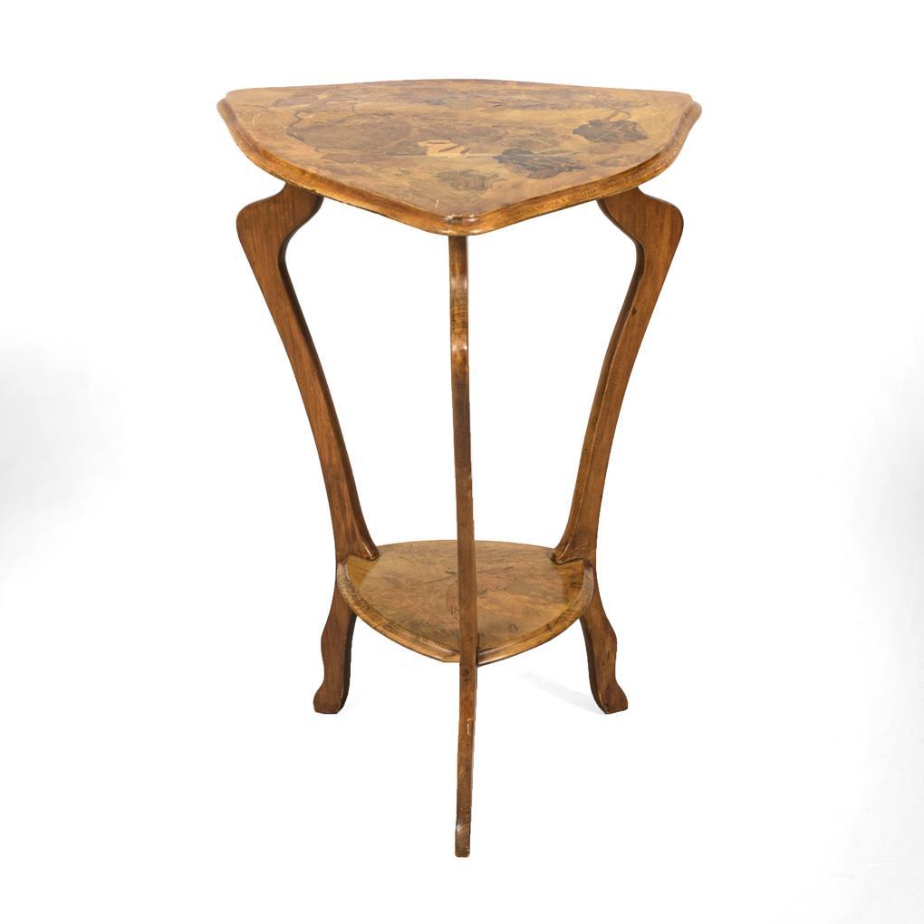 Zierlicher Guéridon mit dreipassig geschwungener Tischplatte, auf 3 geschwungenen Beinen mit Ablagefläche; dekoriert mit Blumenmarketerie und Schmetterling. Restaurierungsbedürftig.