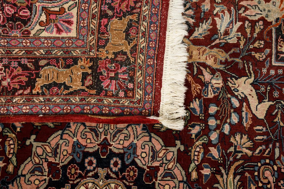 Achtgliedriges Rosettenmedaillon auf reich gemustertem Spiegel mit Vögeln, Hirschen und Raubtieren, Vasenmotiven und verschiedenartigen Blütenzweigen. Mehrreihige Bordüre mit Blumen und Tieren. Leichte Alters- und Gebrauchsspuren.
