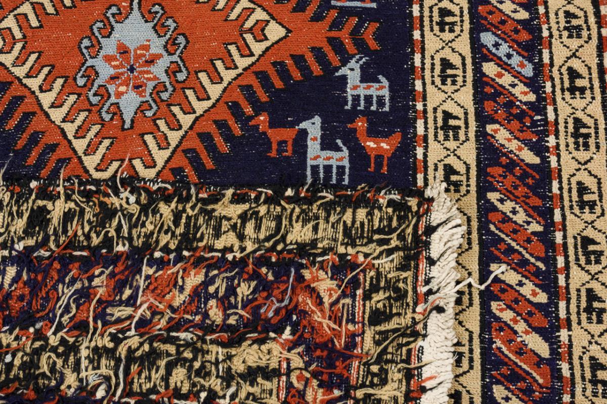 Kaukasischer Dekor mit vier gezahnt geränderten Rautenmedaillons mit hakenbesetzten Ornamenten auf nachtblauem Mittelfeld mit stilisierten Tieren, Reitern und Menschen. Dreireihige Bordüre mit Streifendekor und Kartuschendekor. Alters- und Gebrauchsspuren, partiell Defekte.