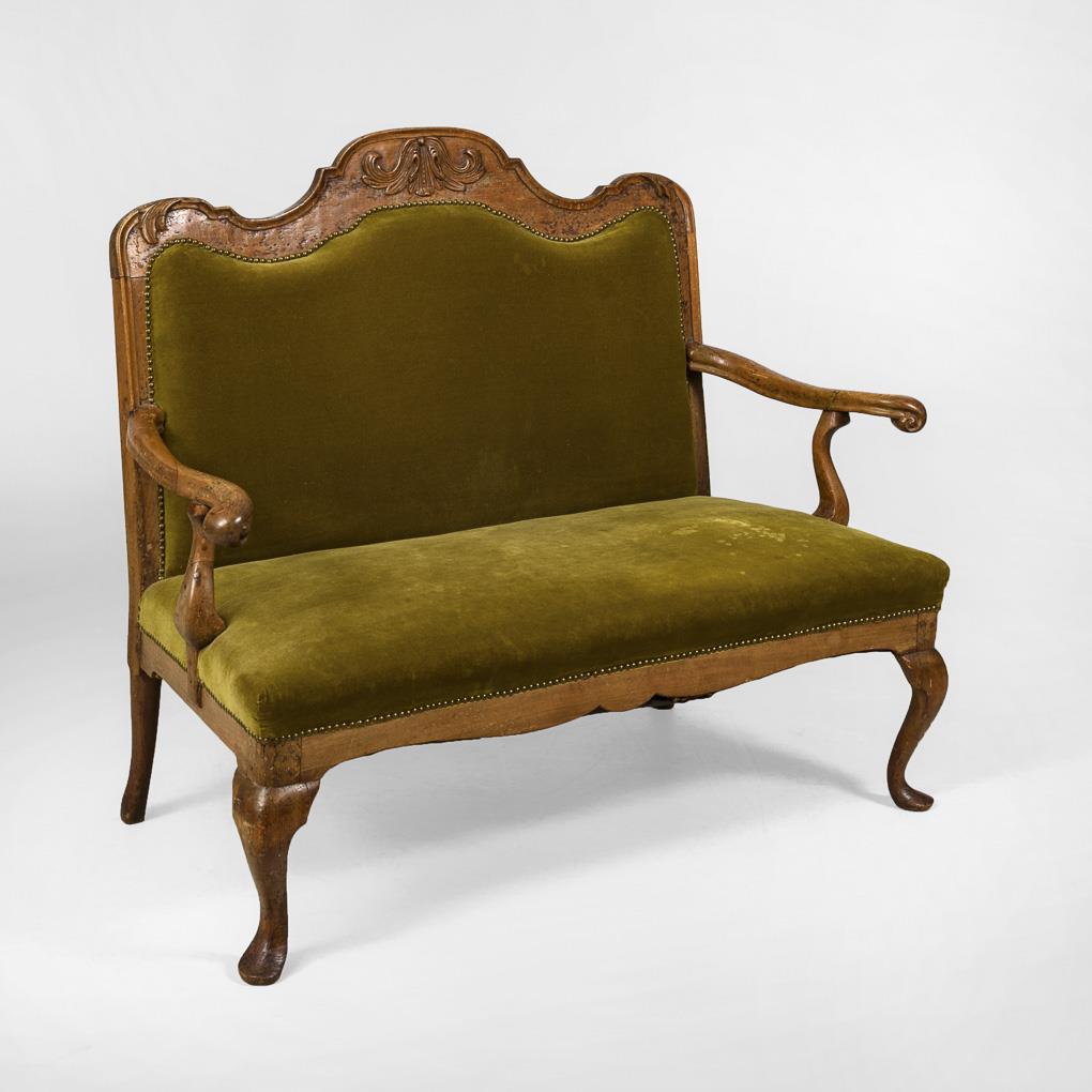 Zierliche, voll gepolsterte Sitzbank in stiltypisch geschwungener Form und breiter Lehnenzierleiste; grüner Samtbezug mit Ziernagelung. Stärkere Alters-/Gebrauchsspuren, alt restauriert, Polster und Bezug ergänzt.