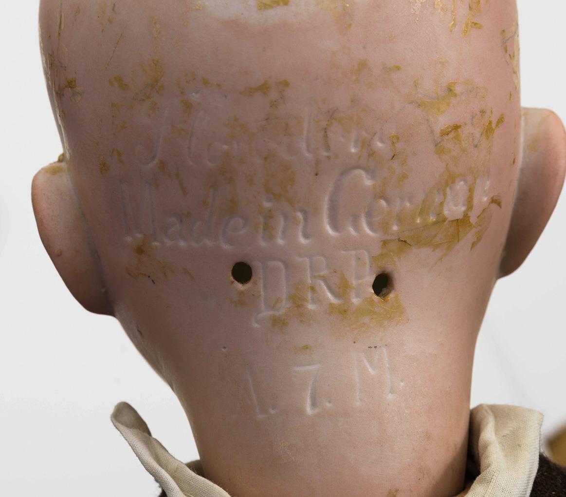 Kurbelkopf, braune Schlafaugen, Reste von eingelegten Fellaugenbrauen, braune Kunsthaarperücke mit Zöpfen. 15-teiliger Gliederkörper. Weißes Unterkleid, brauner Trägerrock, schwarze Wachstuchschuhe. Kopf durchleuchtet: ohne Defekte, Lider beschädigt. Beinansätze mit Farbdefekten, linkes Bein mit sehr stramm gespannter Feder.