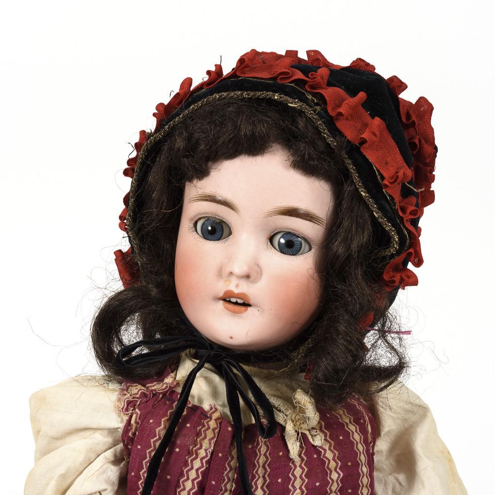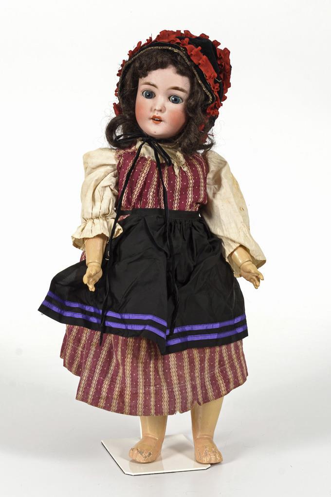 Kurbelkopf, blaue Schlafaugen, dunkelbraune Mohairperücke. 15-teiliger Gliederkörper. Weinrot-weiß gemustertes Kleid, schwarze Schürze, schwarze Samthaube. Kopf durchleuchtet: ohne Defekte. Linkes Auge defekt, Körper übermalt, mit Farbdefekten.