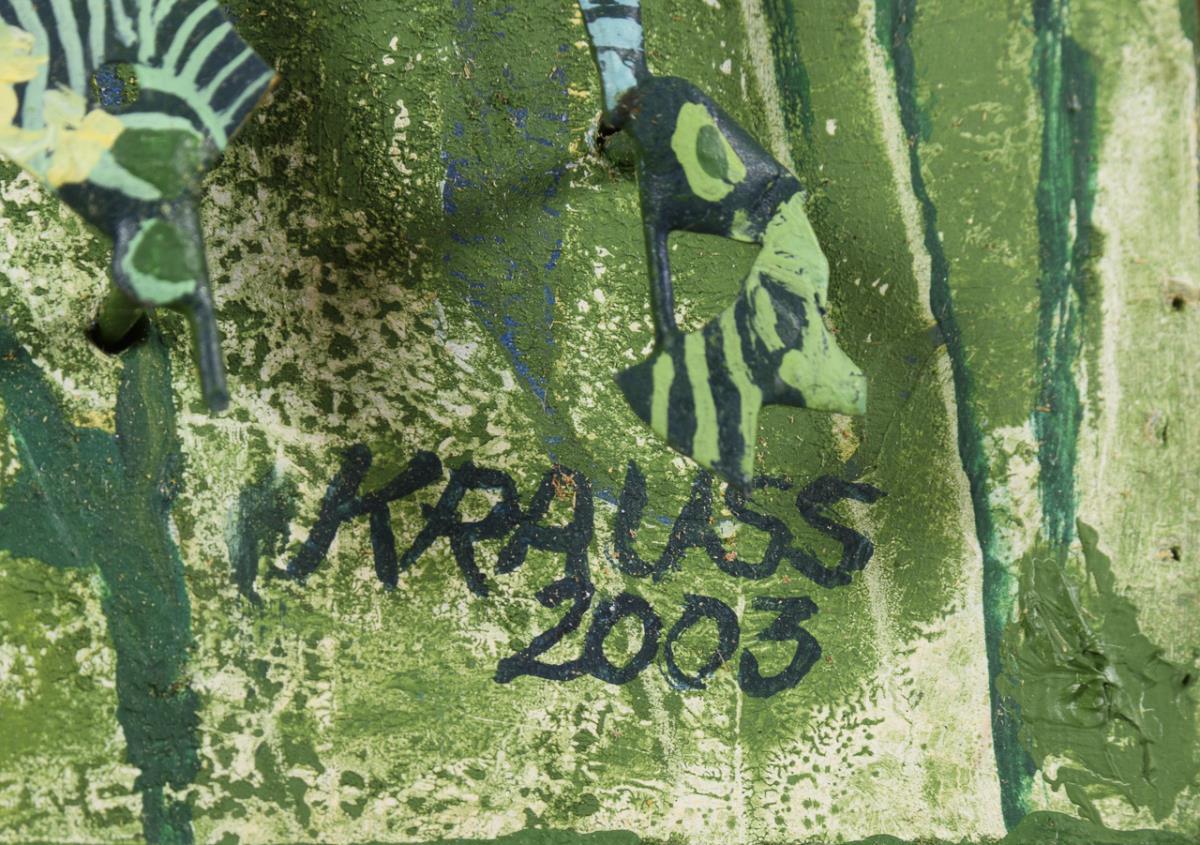 Mischtechnik mit figürlichen Metallapplikationen. Rechts unten signiert, verso bezeichnet/betitelt. Datiert: 2003.