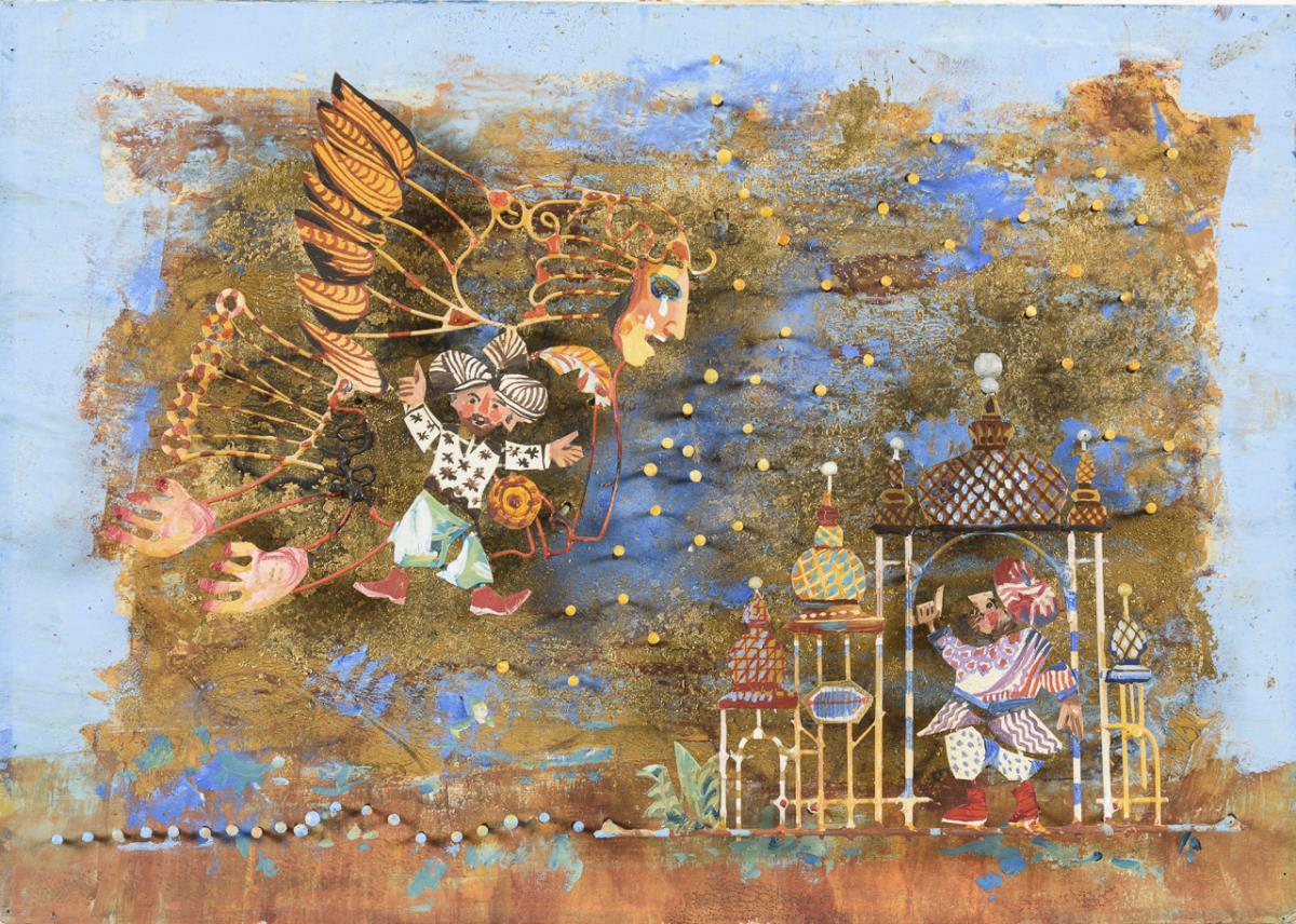 Mischtechnik mit figürlichen Metallapplikationen. Verso signiert/betitelt. Datiert: 2003.