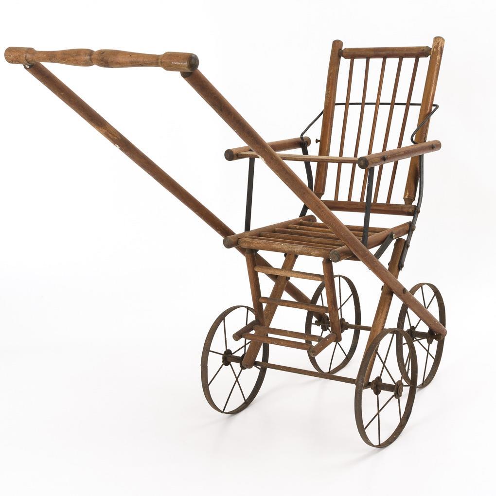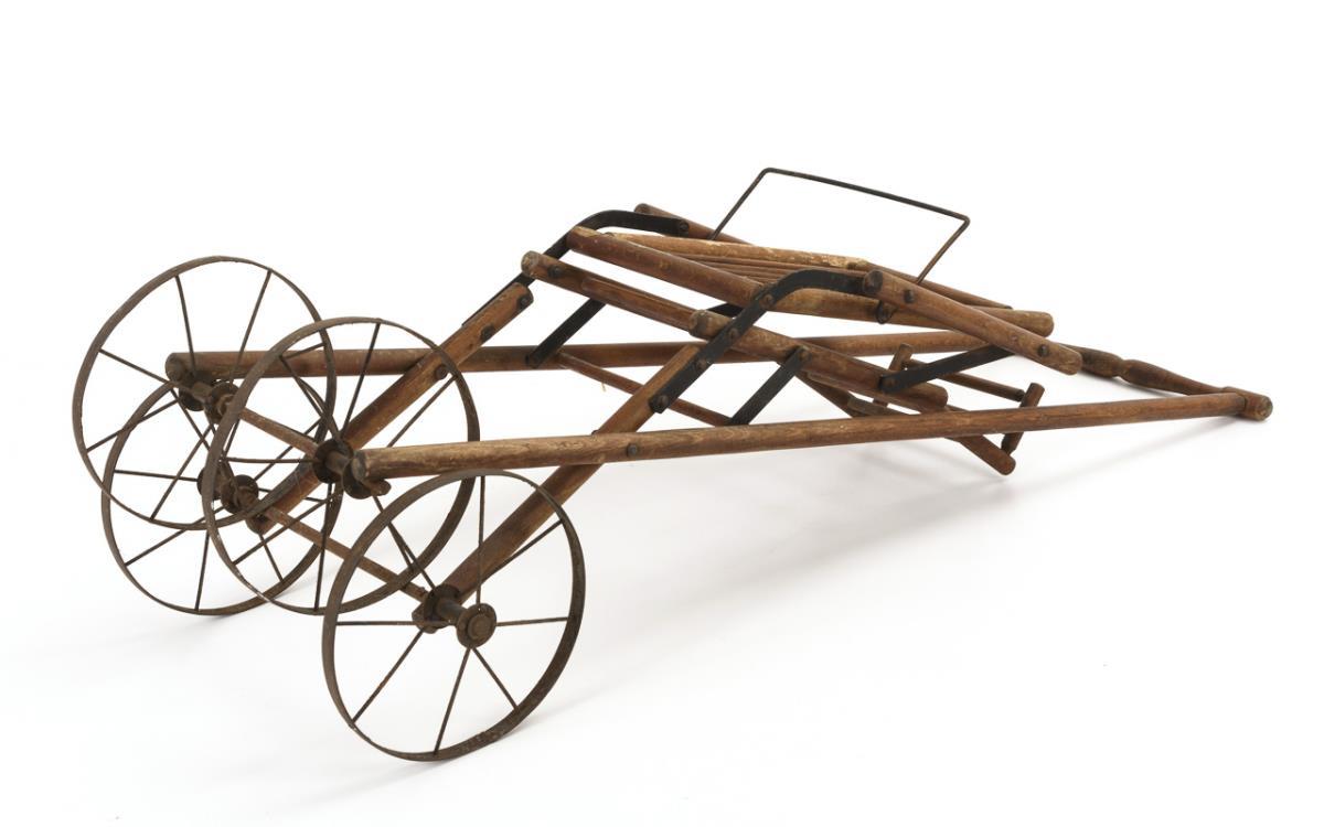Kleiner Wagen mit verstellbarer Rückenlehne und 4 Speichenrädern aus Eisen. Altersspuren, einige Streben wohl ergänzt.