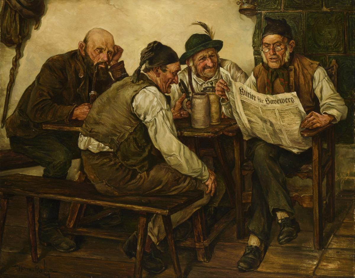 Ältere Männer am Stammtisch beim Lesen der Tageszeitung bei einem Krug Bier. Ein winziger Defekt.