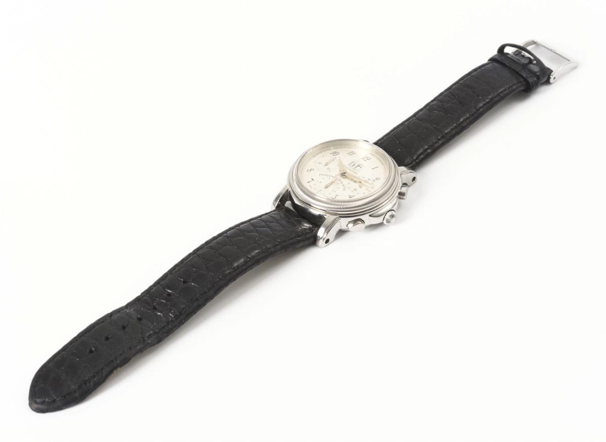 Automatikwerk mit Stellkrone, Drücker für Stoppfunktion. Läuft an. Silberfarbenes Strukturzifferblatt mit arabischen Zahlen, Minutenkranz, Hilfszifferblätter für kleine Sekunde, 30-Minuten und 12-Stunden, Datum mit Schnellschaltung, Dauphin-Zeiger. ManufacturyMarkDial: Grande Date, Philippe du Bois & Fils.