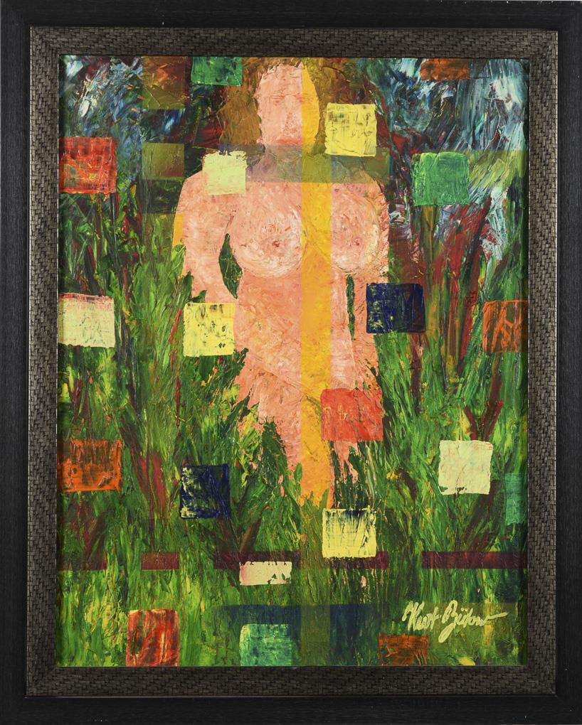 Abstrahierte grüne Landschaft mit stehendem weiblichen Akt.