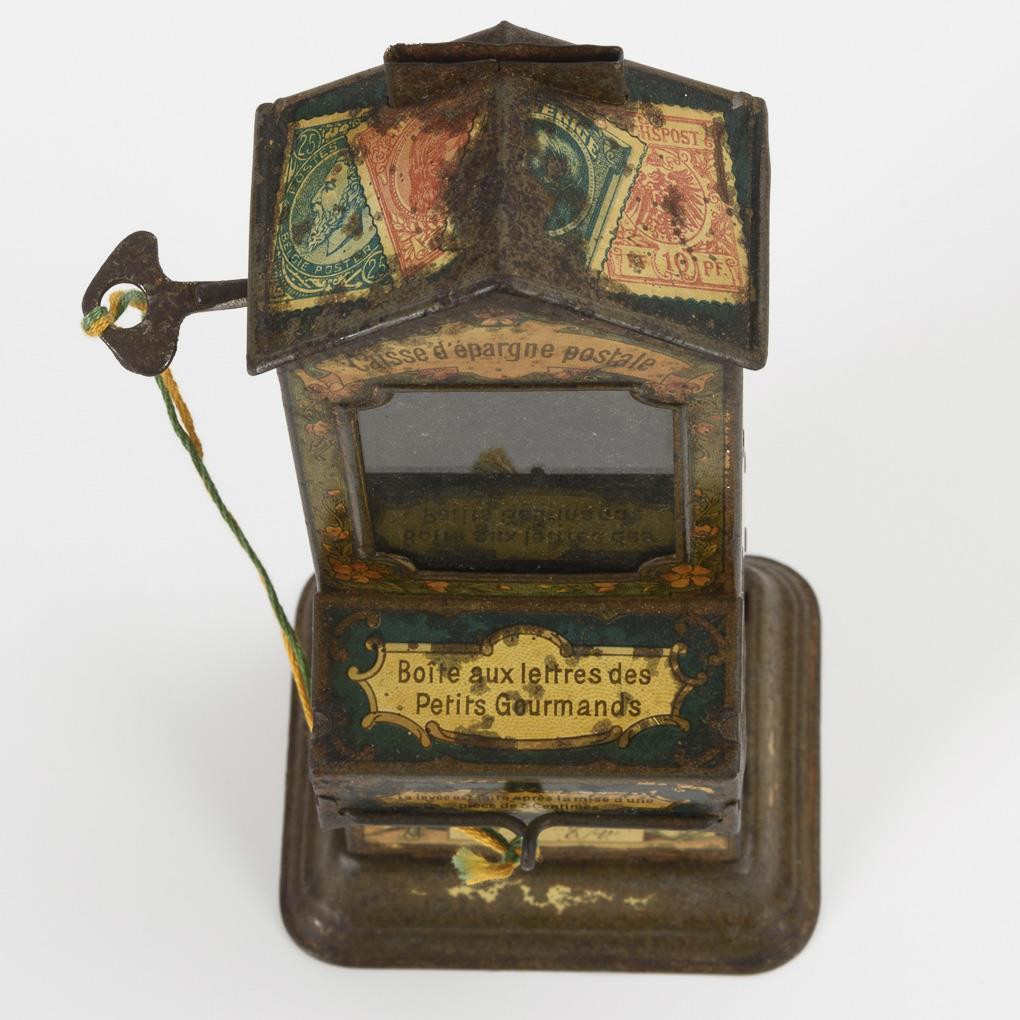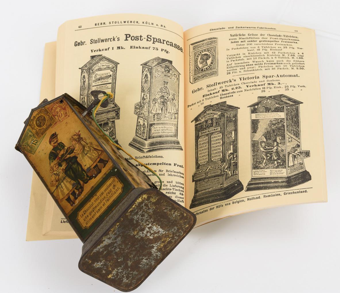 Hochrechteckiger Schokoladen-Sparautomat/-Briefkasten mit Münz- und Tafelschacht, Glasfront und Spendebügel. Allseitig verziert mit Kinderpaaren verschiedener Nationalitäten und Postmotiven. Dazu 1 Heft "Stollwerck's Preis-Liste Weihnachten 1901", Reprint 2003 (19 x 12 cm, 96 Seiten), dort auf S. 96 auch eine Abbildung des Automaten mit Beschriftung in deutscher Sprache. Teils korrodiert.