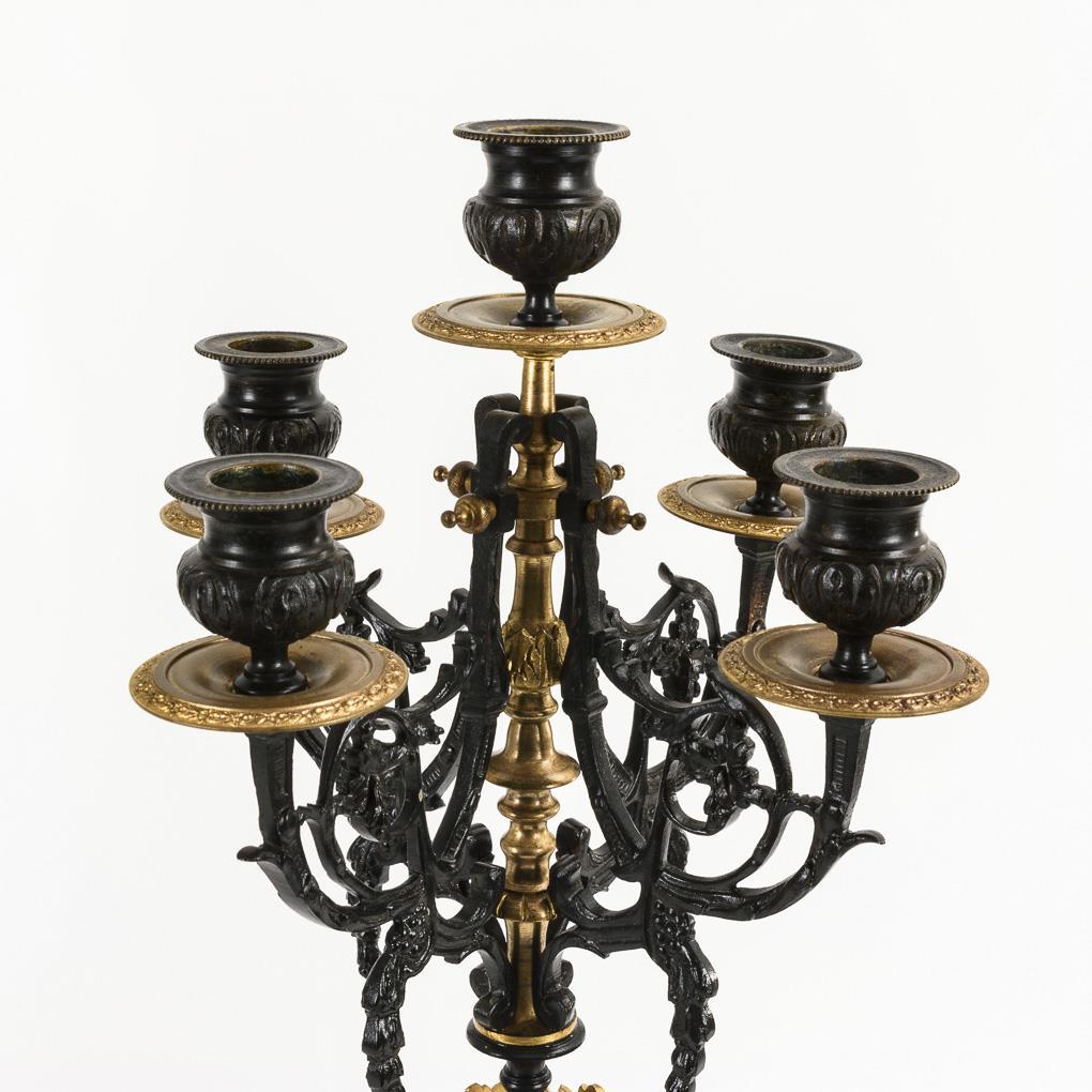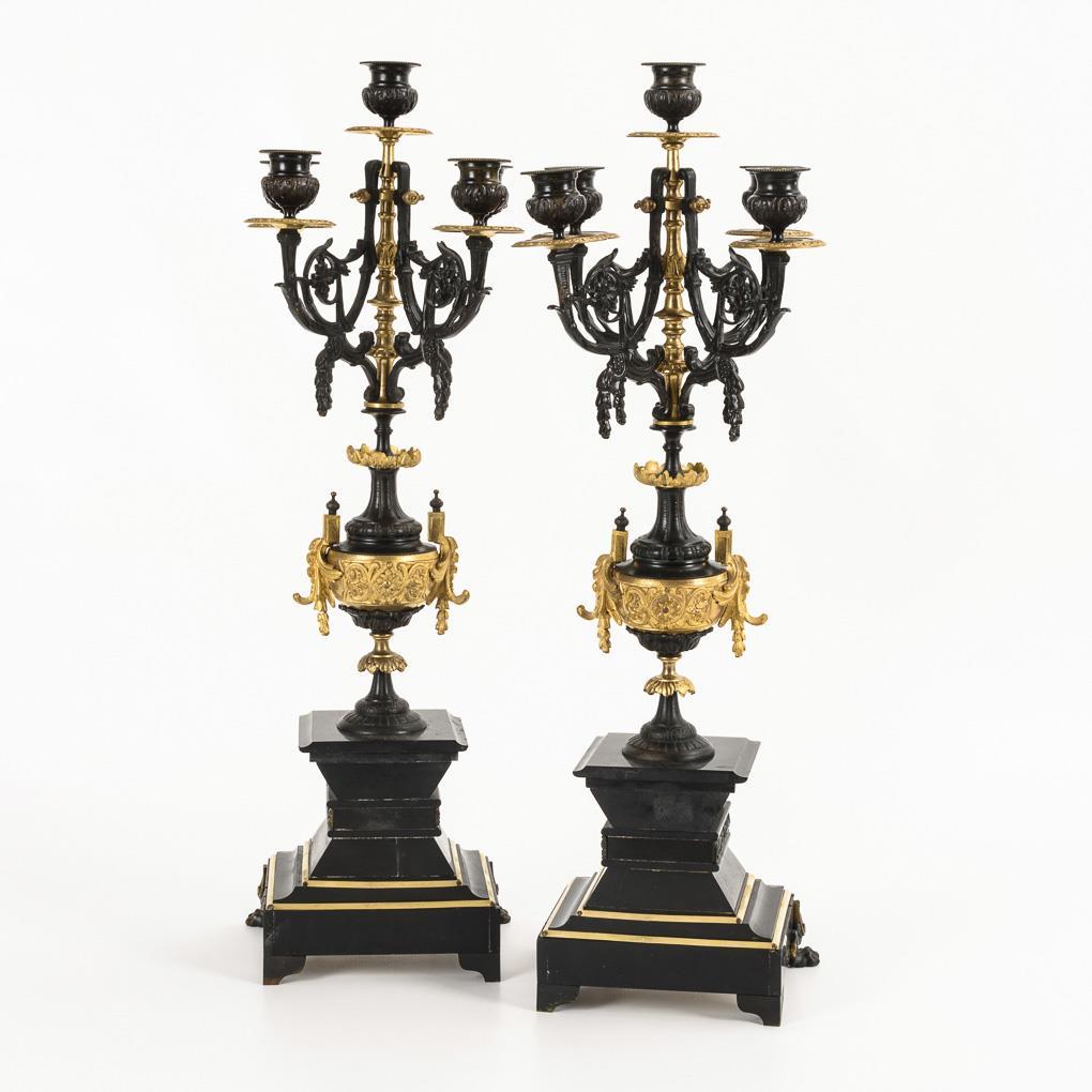 Bronze schwarz patiniert und mit Original-Feuervergoldung, schwarze Marmor-Sockel. H 62 cm.