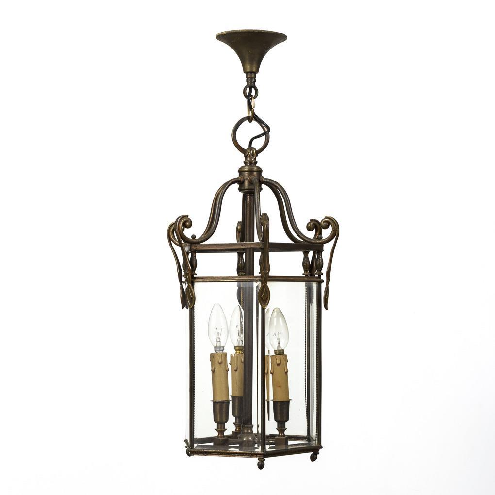 3-flammige Deckenampel mit 6-eckigem Korpus und geschweiftem Gestell, an kurzer Kette mit Trichterbaldachin. Alters-/Gebrauchsspuren, Metall mit leichten Korrosionsspuren.