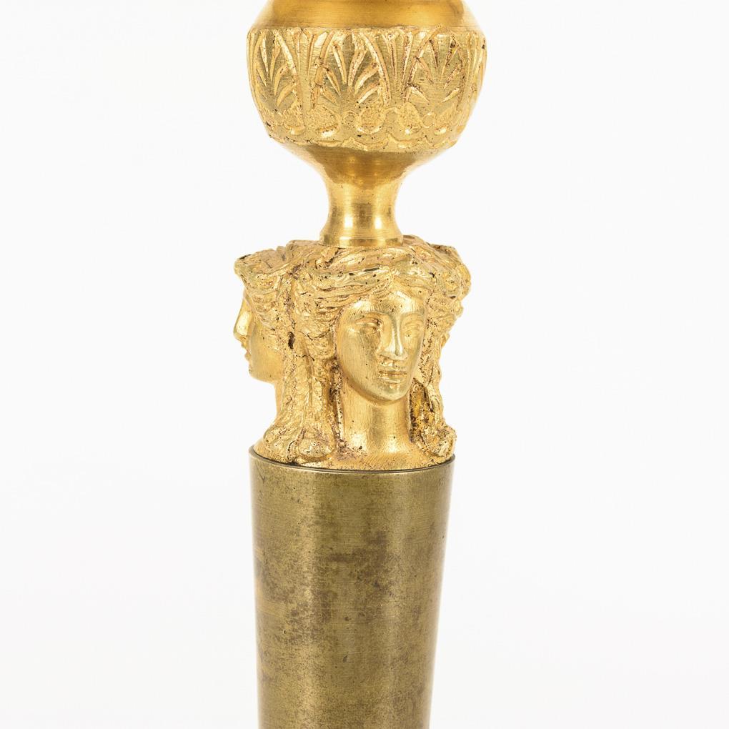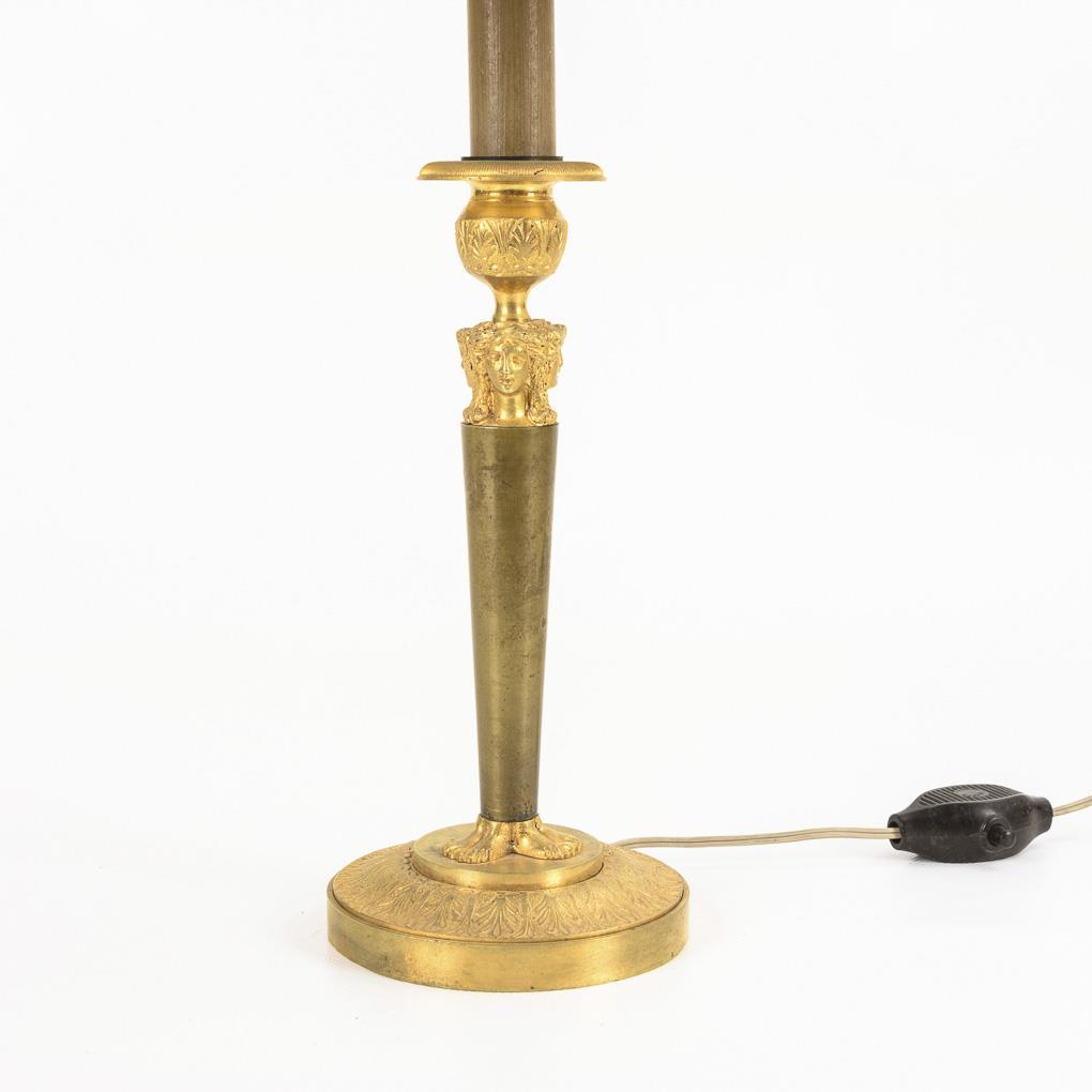 Neoklassizistischer Kerzenleuchter mit 3 Füßen und Köpfen. Aufmontierte 1-flammige Schraubfassung mit Kerzenhülse sowie Schirm. Funktioniert. Neue Elektrik (Schalter original), neuer Schirm.