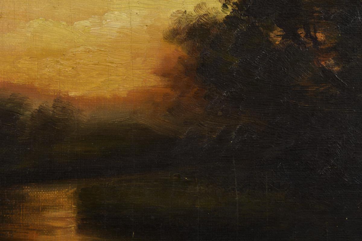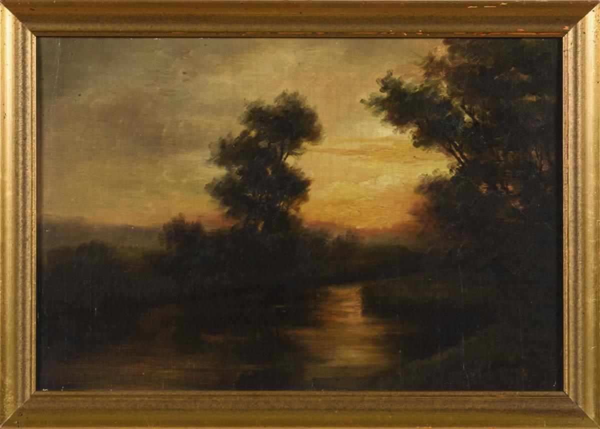 Flusslauf zwischen Bäumen im warmen Abendlicht nach Sonnenuntergang. Leichte Altersspuren.