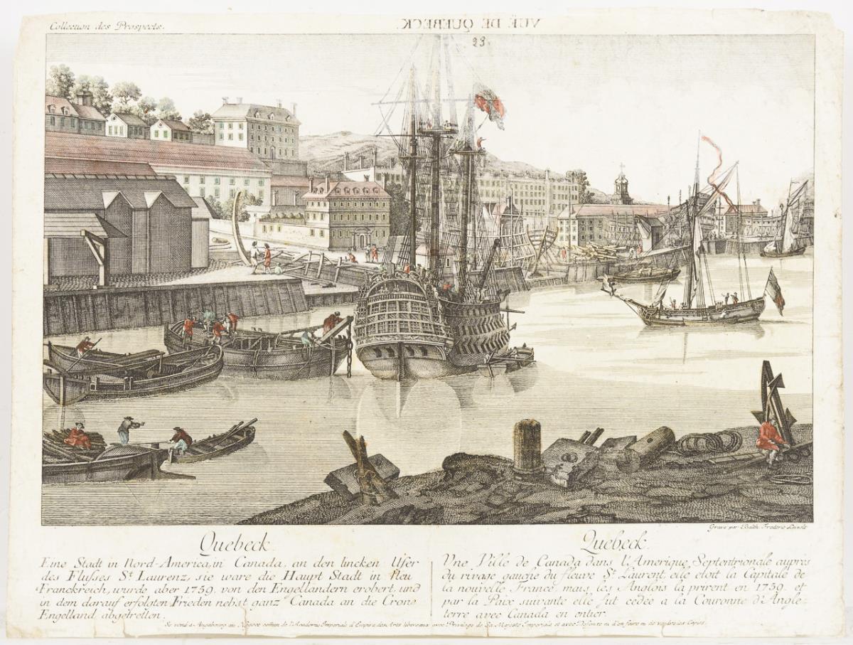 Seitenverkehrte Ansicht der Flusspromenade in der kanadischen Stadt Québec: "Vue de Quebeck", Begleittext in deutscher und französischer Sprache. Beschnitten, mit kleinen Knicken und griffspurig.