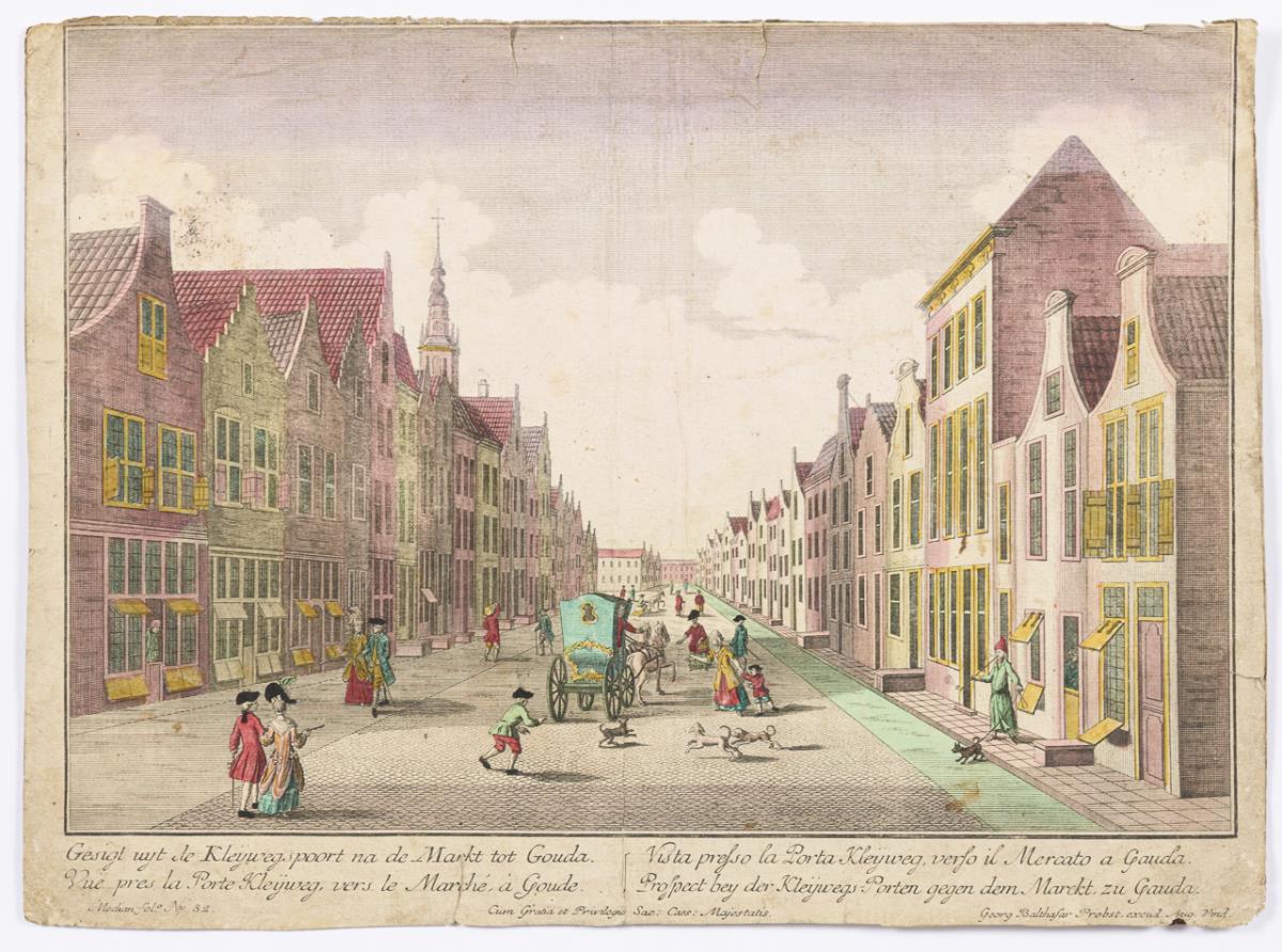 In niederländischer, französischer, italienischer und deutscher Sprache bezeichnet: "Prospect bey der Kleijwegs-Porten gegen dem Marckt zu Gouda". Stark griffspurig, stockfleckig, auf Papier montiert, mit kleinen Rissen.