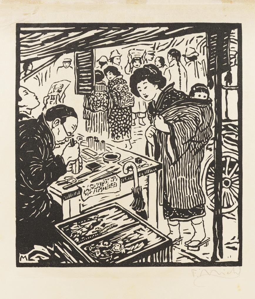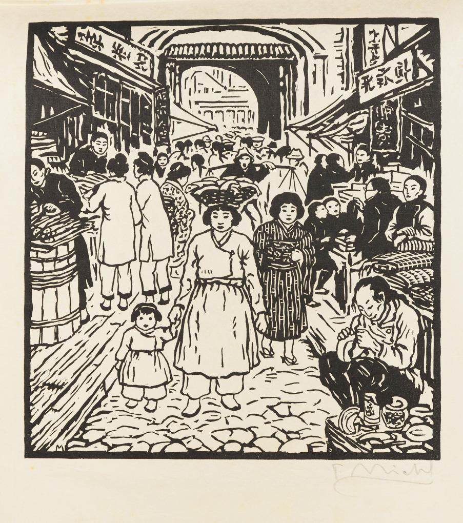 "Straße am Bazar in Wladiwostok" | "Chinesischer Stempelschneider" | "Japanerinnen bei der Toilette". Je minimal stockfleckig.