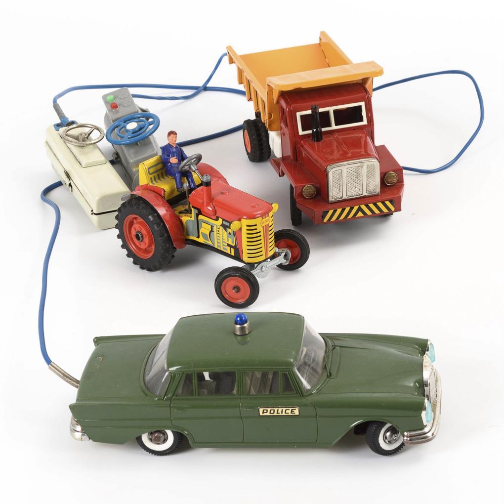1x Fernlenkauto Mercedes, Hersteller Gama, Modell 475: Polizeiauto mit elektrischer Beleuchtung und Blaulicht; im Originalkarton (L Auto 24,5 cm). / 1x Fernlenkauto "2016 Made in Japan": Kipper mit steuerbarer Ladefläche (L Auto 26 cm). / 1x Traktor "Zetor" mit Hänger und Fahrer, Uhrwerkantrieb intakt (L Traktor 14,5 cm, L gesamt 34,5 cm). Teils mit Altersspuren.