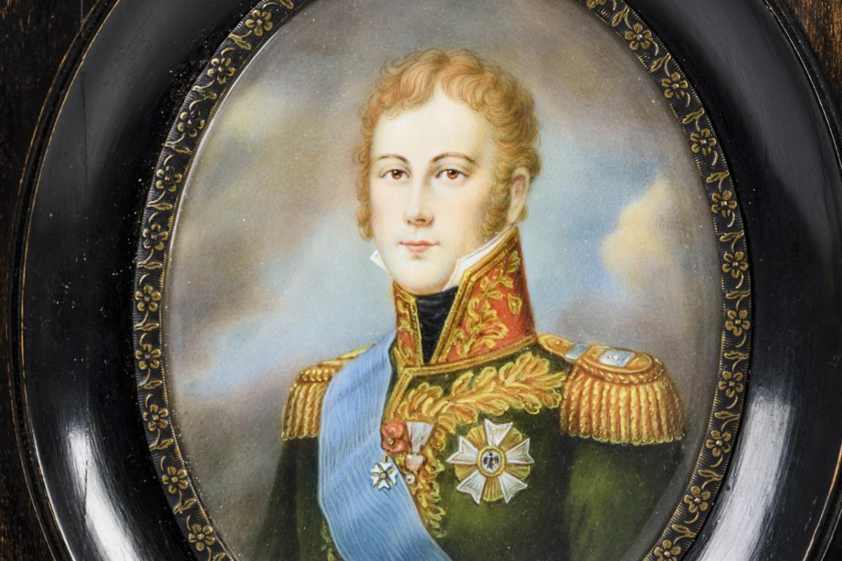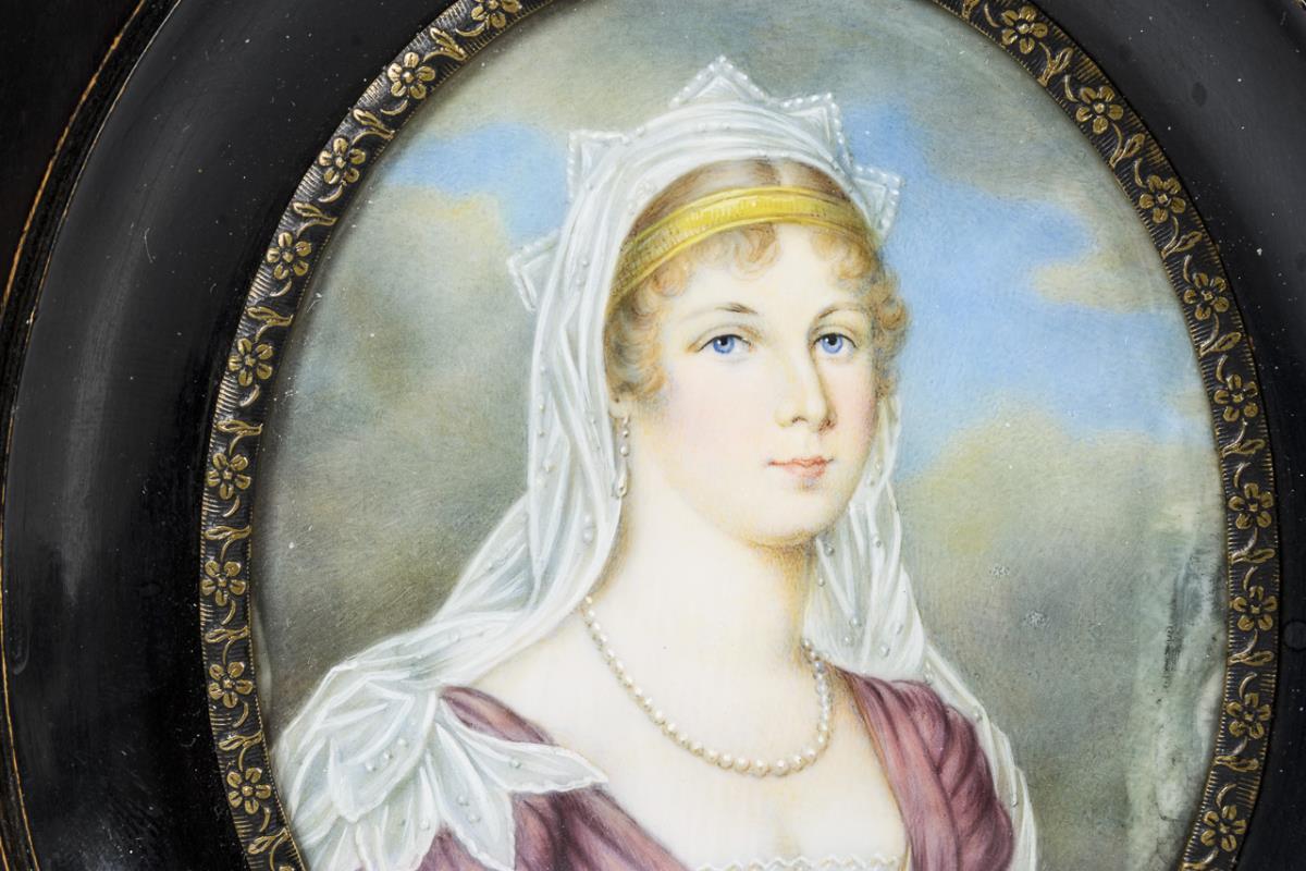 Sehr feine Malerei: Der junge Mann mit dem Großkreuz eines Ordens und blauer Schärpe. Die Frau mit weißem Kopftuch und Perlenschmuck. Farbschäden am Rand v.a. beim Frauenbildnis, leichte Alters-/Gebrauchsspuren an einem Rahmen.