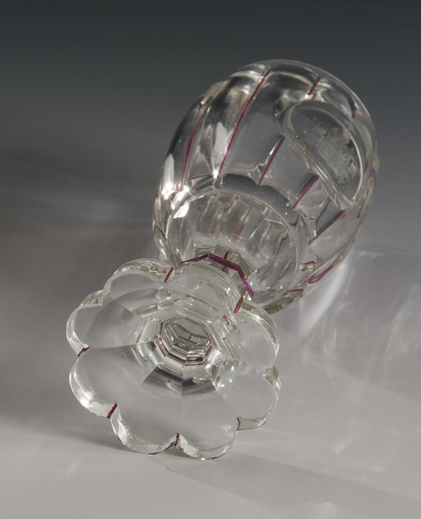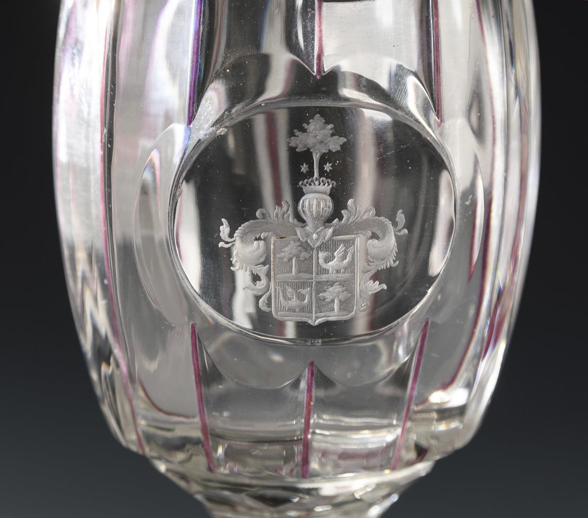 Gerade godroniert geschliffene Kuppa, facettierter, nodierter Schaft, mehrpassiger Fuß. Schauseitig ein hochgeschliffenes Medaillon mit einer gravierten Wappendarstellung. Ohne Deckel, Spannungsriss in der Wandung.