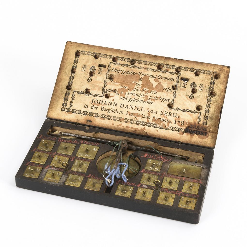 Balkenwaage mit Gewichtssatz von 18 Gewichten und 6 Blattgewichten. Für Pistolen, Gulden, Ducaten, Ginee, Louidor und Carolus. Holzkästchen mit eingeklebtem Zettel und zwei Schließen.