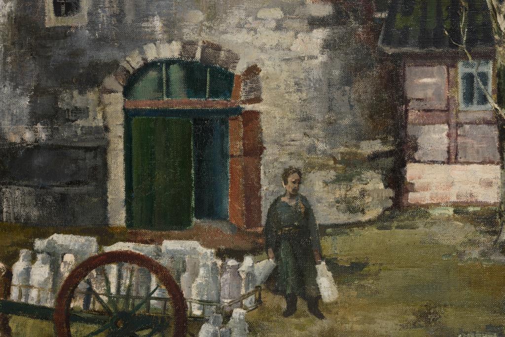 Pferdekarren mit den Milchflaschen vor dem alten Mühlenturm.