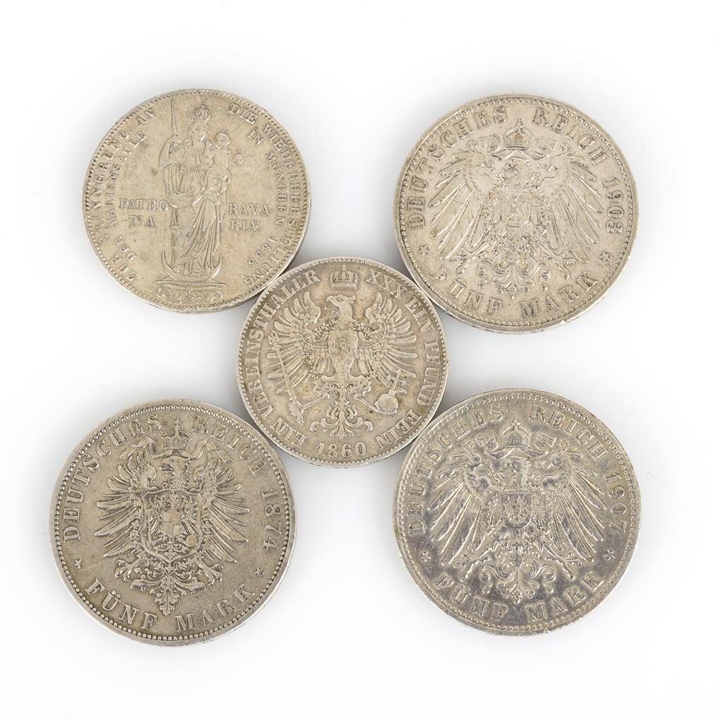 Doppelgulden "Maximilian II Koenig v. Bayern", 1855. / Vereinsthaler "Friedr. Wilhelm IV Koenig v. Preussen", 1860 / 5 Mark "Otto Koenig von Bayern", 1907. / 5 Mark "Wilhelm Deutscher Kaiser König v. Preussen", 1874. / 5 Mark "Wilhelm II Deutscher Kaiser König v. Preussen". Zustand: sehr schön.
