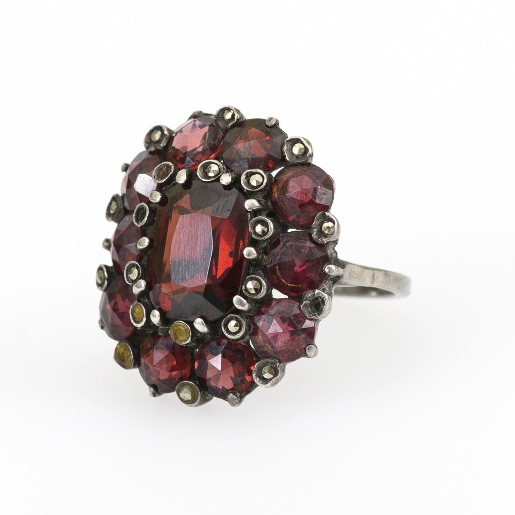 11 gefasste Granate und diverse kleine Markasiten, zwischen schmaler Schiene. 7 Markasite fehlen.