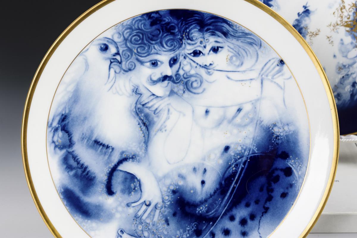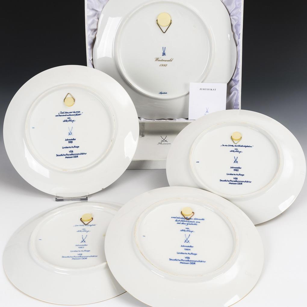 1x Wandteller "Winterwald 1992" (mit Zertifikat, im Originalkarton). / 4 Märchenteller, Entwurf Ukki Ukleya: "und das war die erste von tausendundeiner Nacht" (1981), "In den Gärten der Glückseligkeiten" (1982), "Der Kalif von Bagdad" (1983) und "und als der Morgen dämmerte hielt Scheherezade inne mit ihrer Geschichte" (1984).