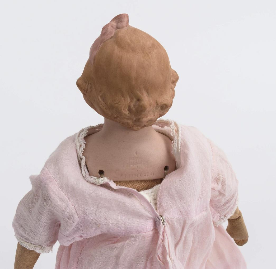 Modellierter Kopf mit staunendem Gesichtsausdruck, gemalten, zur Seite blickenden Augen und modellierten Haaren mit rosa Schleife. Stoffkörper mit gemalten Schuhen. Rosa Kleid.