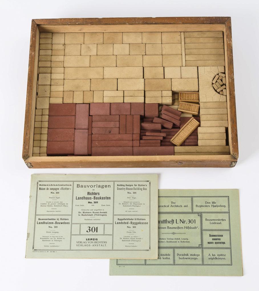 Wenig bespielter Baukasten mit roten und weißen Steinen sowie 2 Pappkästchen mit Zubehör. Dazu "Bauvorlagen" und "Schnittheft L 301". Altersspuren, Vollständigkeit nicht geprüft, Deckel defekt.