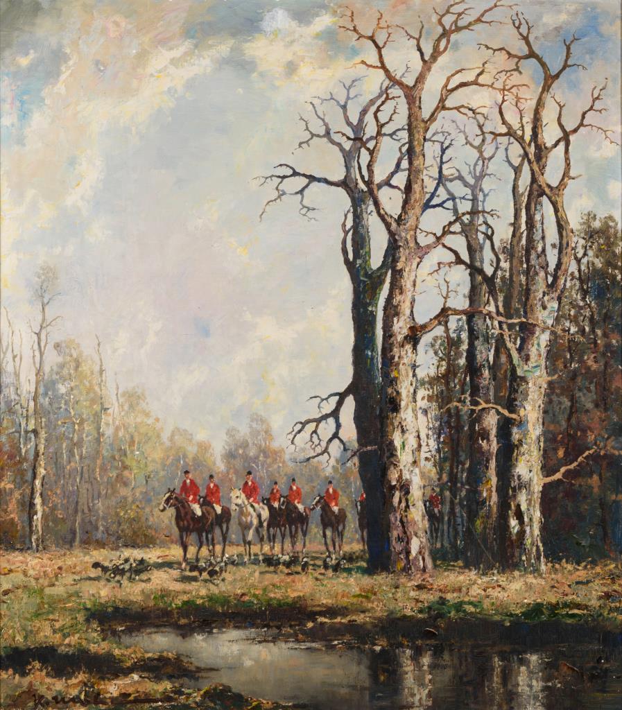 Die Reiter in rot-weißer Kleidung am Waldrand mit den Hunden.