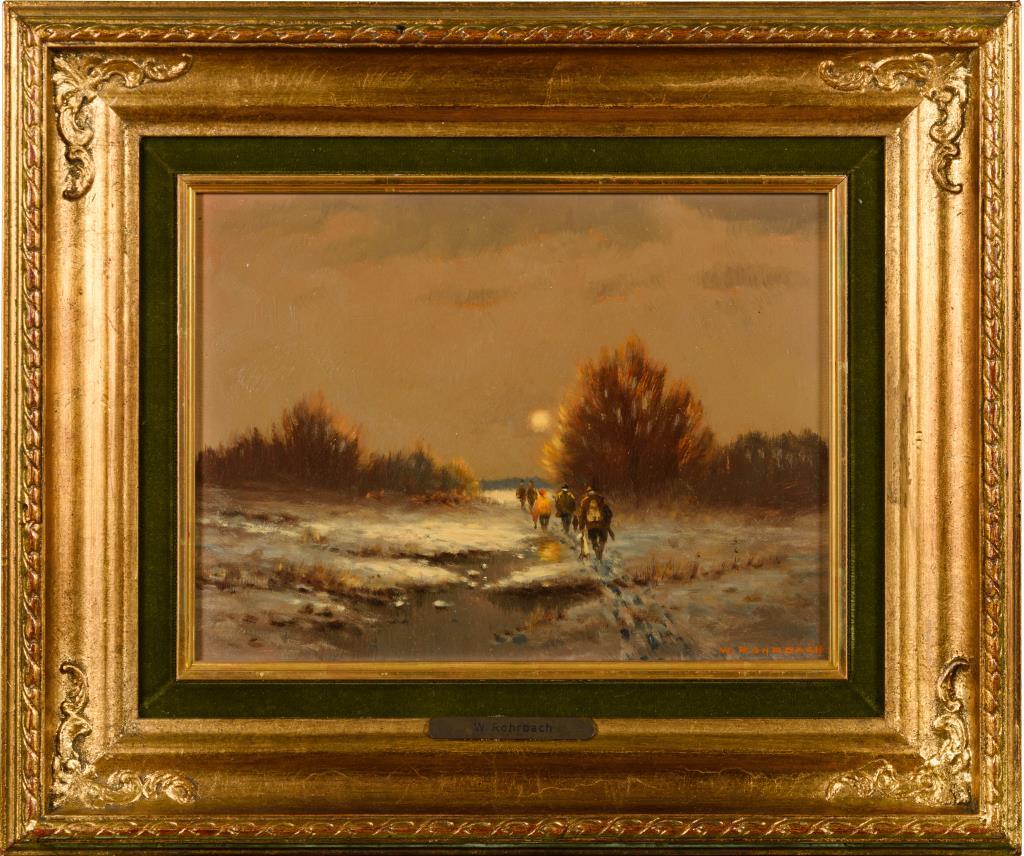 Jagdgesellschaft bei tief stehender Sonne in Winterlandschaft.