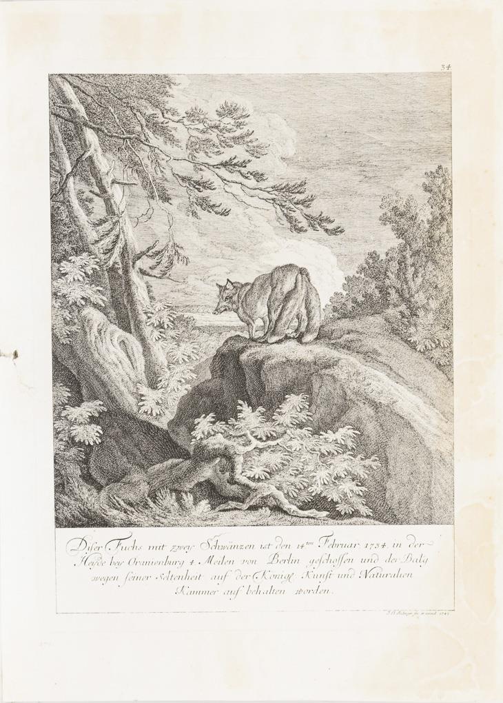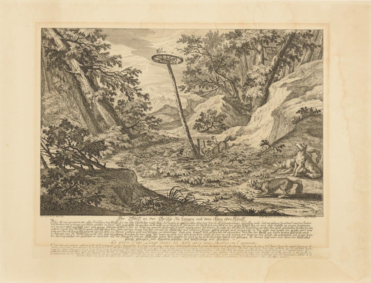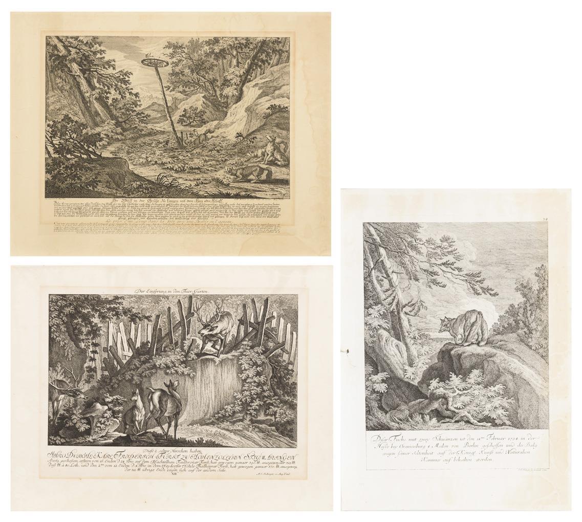 "Diser Fuchs mit zwey Schwänzen [...]", Blatt: 45,5 x 33 cm, stockfleckig, Riss am linken Rand | "Der Einsprung in den Thiergarten", Blatt: 34,5 x 45,5 cm, mit Lichtschaden, etwas fleckig | "Der Wolff in der Grube zu fangen mit dem Lam oder Schaff", Blatt: 41 x 54,5 cm, mit Lichtschaden, Wasserflecken.