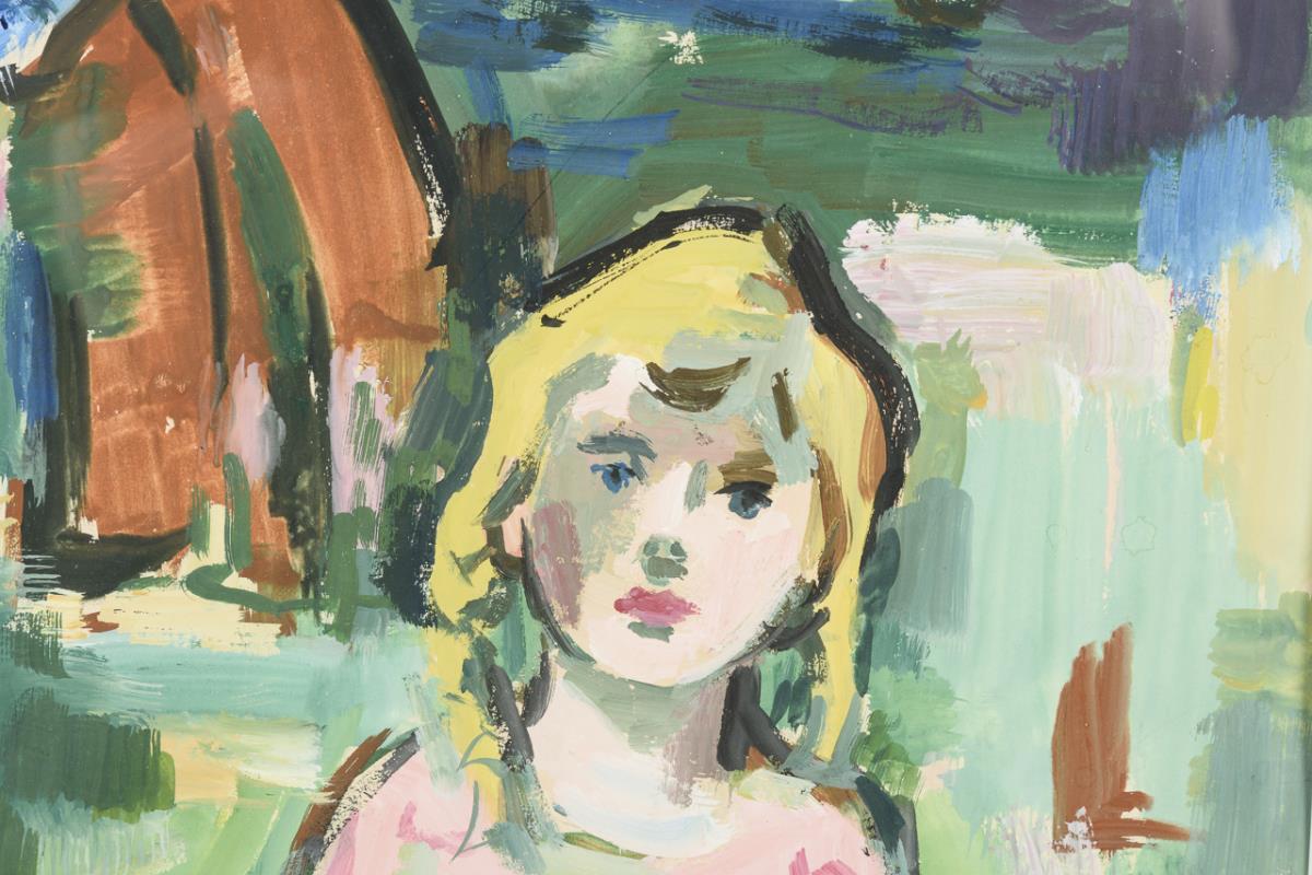 Mädchen mit Korb im Garten nahe einer Sonnenblume und der arbeitenden Mutter.