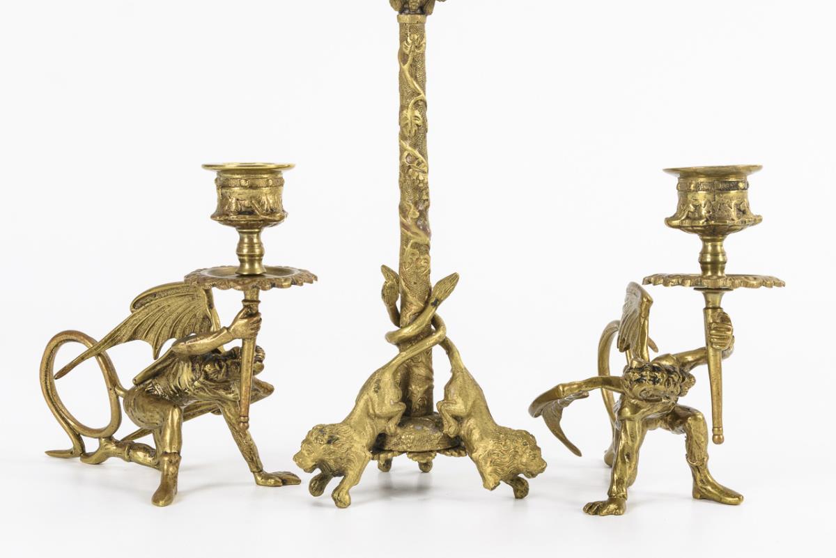 Paar spiegelbildlich gearbeitete Bronzeleuchter mit Luzifer. Schlanker Leuchter mit 3 vollplastischen Löwen als Füße und 3 Ziegenköpfen an der Tülle. 1 Löwenbein fehlt, 1 Riss am Ziegenkopf, sonst kaum Alters-/Gebrauchsspuren.
