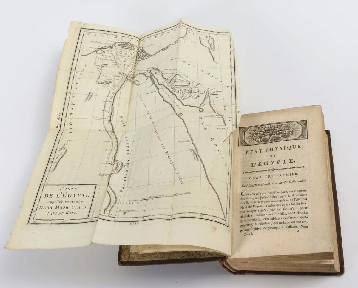 Zwei Teile in einem Band, 14, 383, 8, 458, (4) Seiten. 2 Landkarten und 3 Tafeln zu Balbek und Palmyra. In französischer Sprache. Ledereinband jünger nachgebunden unter Verwendung alter Teile, Gebrauchsspuren, Block fest, Tafeln etwas geknickt.