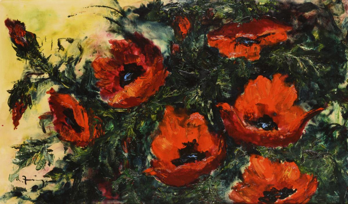 Modernes Mohnbild mit großen roten Blüten vor hellem Hintergrund.