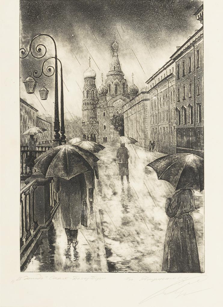 Russischer Künstler: Passanten im verregneten St. Petersburg