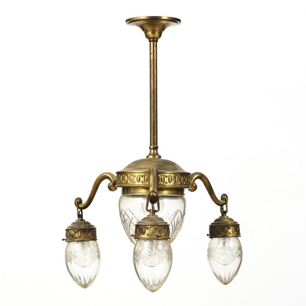4-flammige Hängelampe mit tropfenförmigem Mittelschirm an tellerförmiger Halterung und Messingschaft mit Trichterbaldachin, 3 geschweifte Arme mit abhängenden Tropfenschirmen mit Kerbschliff. Minimale Alters-/Gebrauchsspuren.