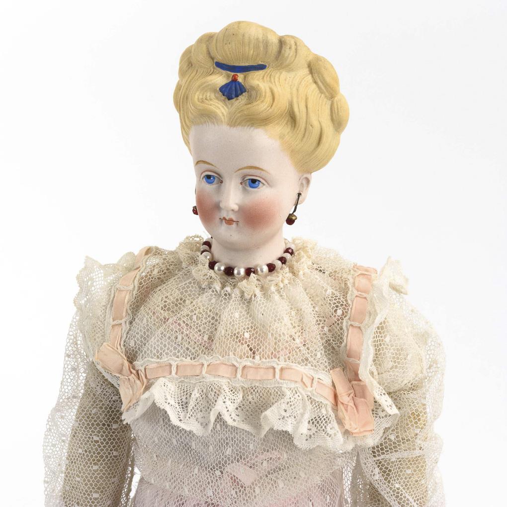 Gemalte blaue Augen, originale Ohrringe, kunstvoll modellierte Modefrisur. Lederkörper mit Biskuitunterarmen. Helles Spitzenkleid, Ringelstrümpfe, rotbraune Lederschuhe. Kopf ohne sichtbare Defekte, Körper mit leichten Altersspuren (rieselt etwas).